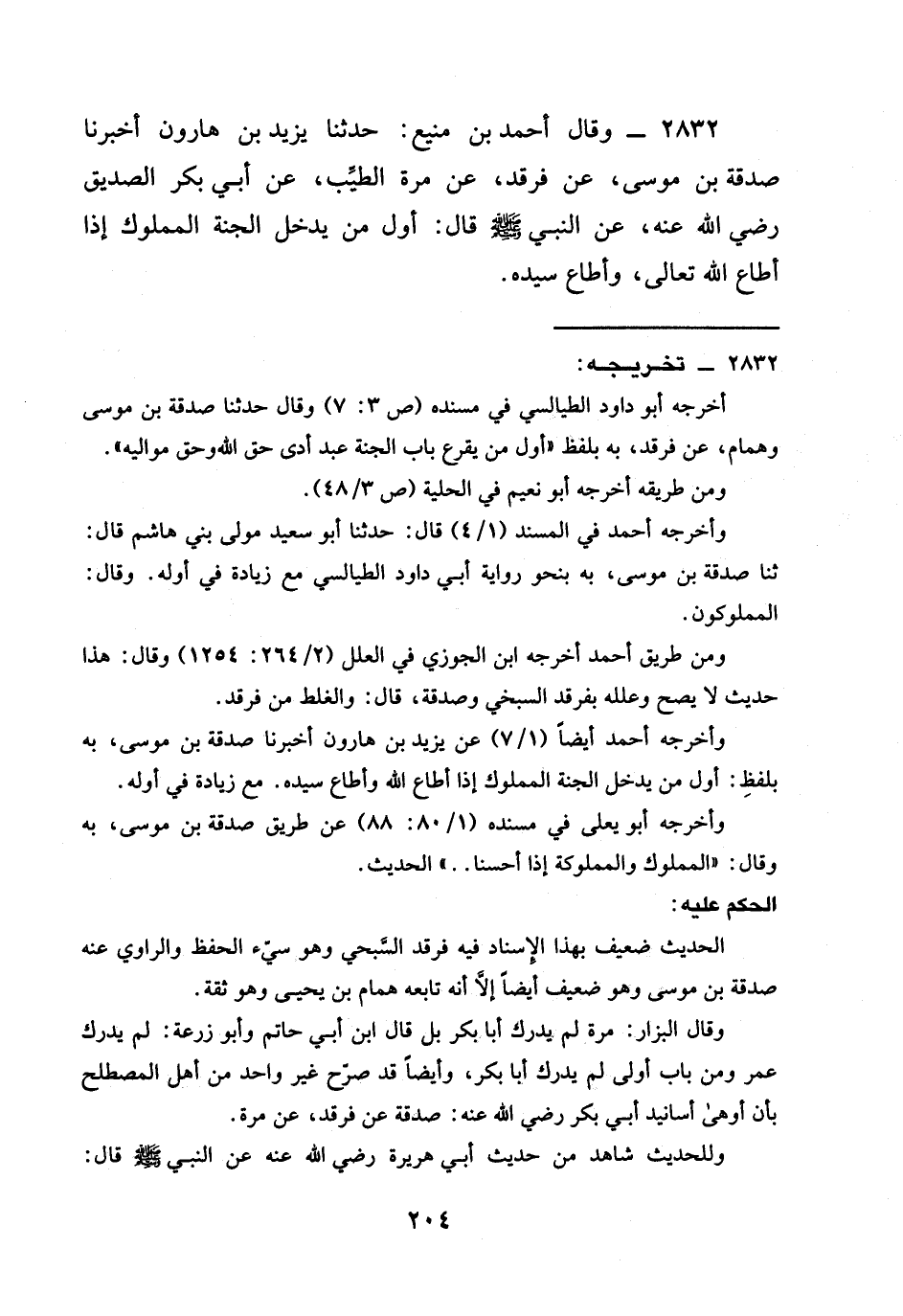 2832 - وَقَالَ أَحْمَدُ بْنُ مَنِيعٍ: حَدَّثَنَا يَزِيدُ بن هارون أخبرنا صَدَقَةُ بْنُ مُوسَى، عَنْ فَرْقَدٍ، عَنْ مُرَّةَ الطَّيِّبِ، عَنْ أَبِي بَكْرٍ الصديق رَضِيَ الله عَنْه، عن النبي صَلَّى اللَّهُ عَلَيْهِ وَسَلَّمَ قَالَ: §أَوَّلُ مَنْ يَدْخُلُ الْجَنَّةَ الْمَمْلُوكُ إِذَا أطاع الله تعالى، وأطاع سَيِّدَهُ.