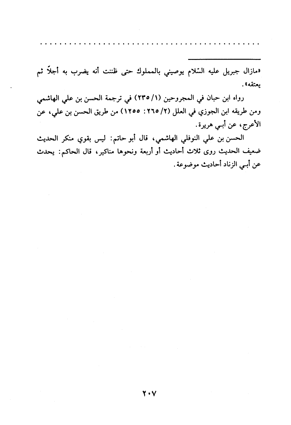 الحسن بن علي النوفلي الهاشمي، قال أبو حاتم: ليس بقوي منكر الحديث ضعيف الحديث روى ثلاث أحاديث أو أربعة ونحوها مناكير، قال الحاكم: يحدث عن أبي الزناد أحاديث موضوعة.
