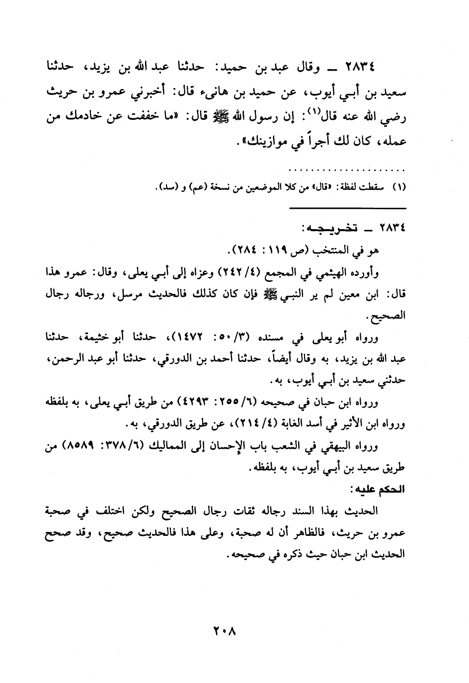 2834 - وَقَالَ عَبْدُ بْنُ حُمَيْدٍ: حَدَّثَنَا عَبْدُ اللَّهِ بْنُ يَزِيدَ، حدثنا سَعِيدُ بْنُ أَبِي أَيُّوبَ، عَنْ حُمَيْدِ بْنِ هَانِئٍ قَالَ: أَخْبَرَنِي عَمْرُو بْنُ حريث رَضِيَ الله عَنْه قال: أَنَّ رَسُولَ اللَّهِ صَلَّى اللَّهُ عَلَيْهِ وَسَلَّمَ قَالَ: " §مَا خَفَّفْتَ عَنْ خادمك من عمله، كَانَ لَكَ أَجْرًا فِي مَوَازِينِكَ ".