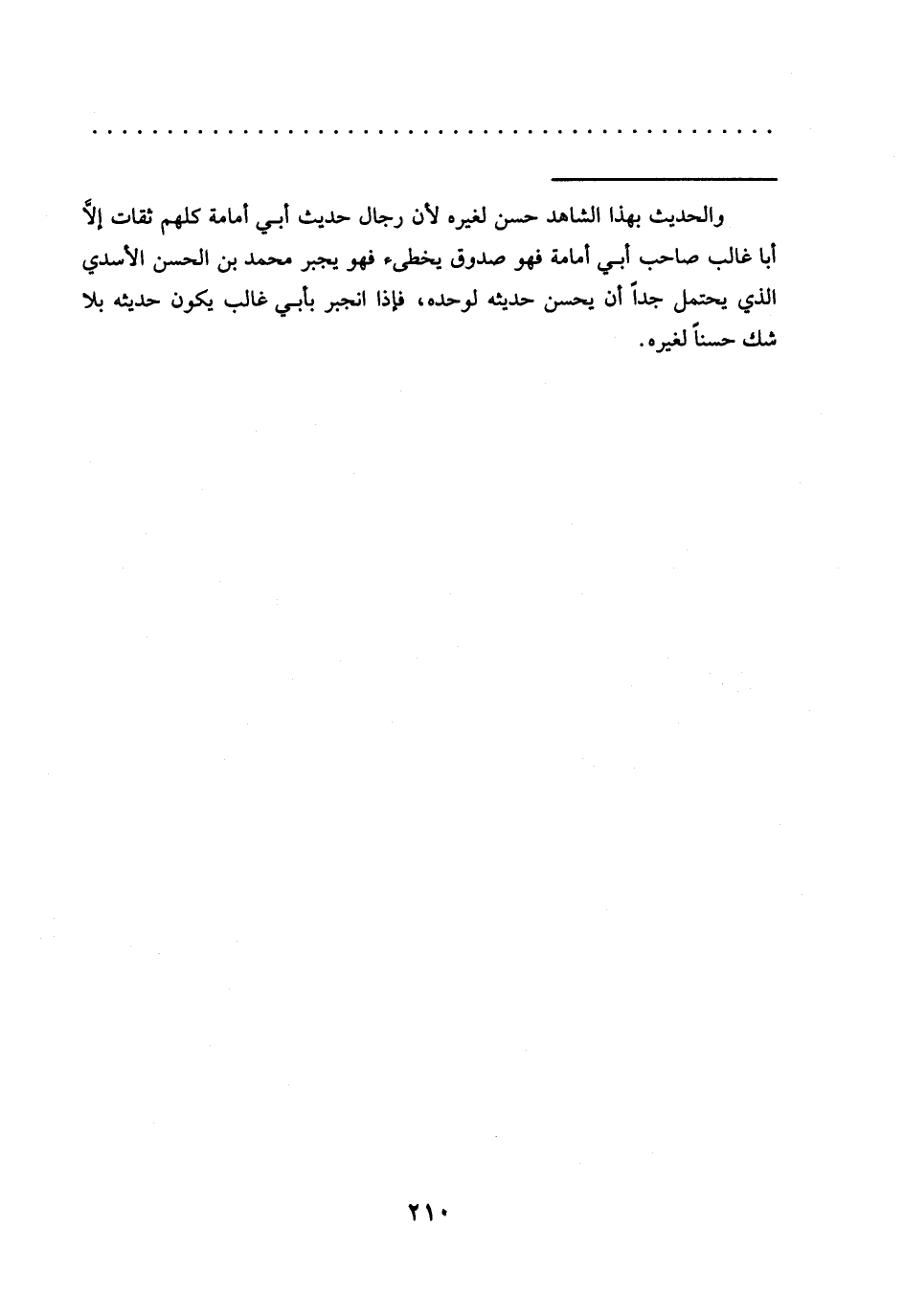 = والحديث بهذا الشاهد حسن لغيره لأنّ رجال حديث أبي أمامة كلهم ثقات إلّا أبا غالب صاحب أبي أمامة فهو صدوق يخطئ فهو يجبر محمَّد بن الحسن الأسدي الذي يحتمل جدًا أن يحسن حديثه لوحده، فإذا انجبر بأبي غالب يكون حديثه بلا شك حسنًا لغيره.
