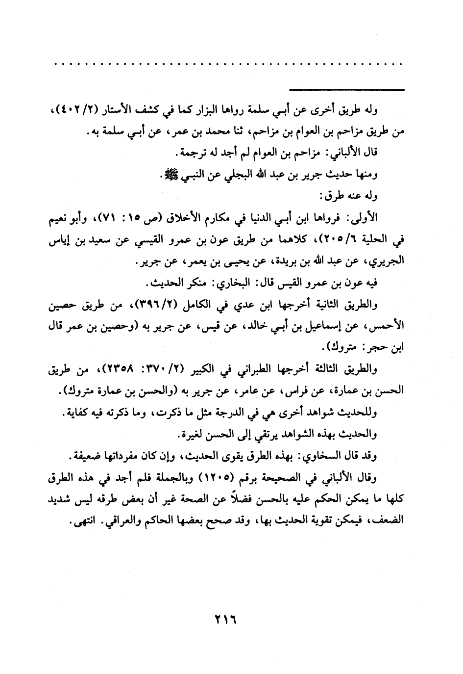 الأولى: فرواها ابن أبي الدنيا في مكارم الأخلاق (ص 15: 71)، وأبو نعيم في الحلية 6/ 205)، كلاهما من طريق عون بن عمرو القيسي عن سعيد بن إياس الْجُرَيْرِيُّ، عَنْ عَبْدِ اللَّهِ بْنِ بُرَيْدَةَ، عَنْ يحيي بن يعمر، عن جرير.