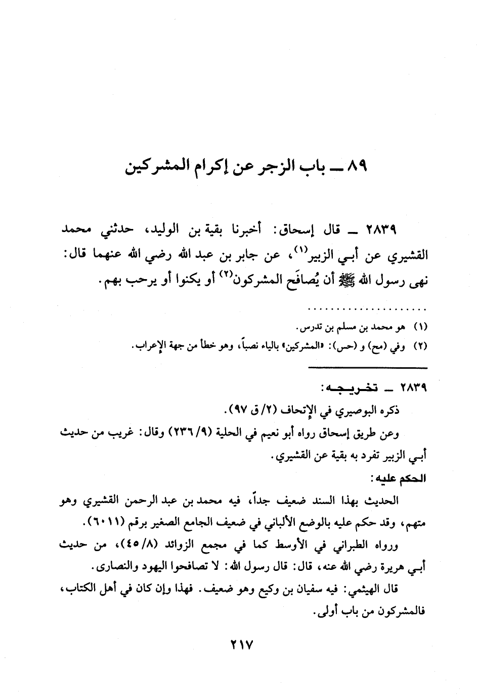 2839 - قَالَ إِسْحَاقُ: أَخْبَرَنَا بَقِيَّةُ بْنُ الْوَلِيدِ، حَدَّثَنِي مُحَمَّدٌ الْقُشَيْرِيُّ عَنْ أَبِي الزُّبَيْرِ، عَنْ جَابِرِ بْنِ عبد الله رَضِيَ الله عَنْهما قَالَ: §نَهَى رَسُولُ اللَّهِ صَلَّى اللَّهُ عَلَيْهِ وَسَلَّمَ أَنْ يُصَافَحَ المشركون أو يكنوا أَوْ يُرَحَّبَ بِهِمْ.