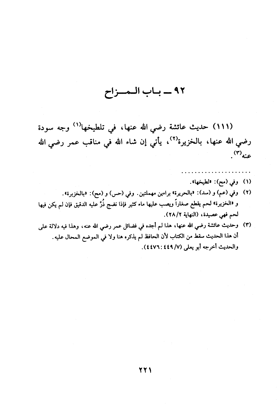 (111) حديث عائشة رَضِيَ الله عَنْها، فِي تَلْطِيخِهَا وجه سودة رَضِيَ الله عَنْها، بالخزيرة، يأتي إن شاء الله فِي مَنَاقِبِ عُمَرَ رَضِيَ الله عَنْه.