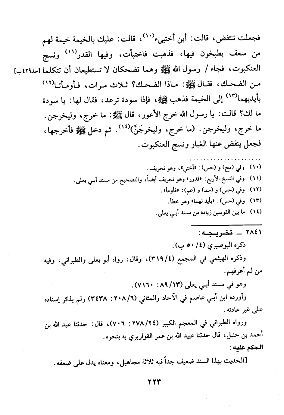 فجعلت تنتفض، قالت: أين أختبىء (¬10)، قَالَتْ: عَلَيْكِ بِالْخَيْمَةِ خَيْمَةٌ لَهُمْ مِنْ سَعَفٍ يطبخون فيها، فذهبت فاختبأت، وفيها القدر (¬11) وَنَسْجُ الْعَنْكَبُوتِ، فَجَاءَ رَسُولُ اللَّهِ -صَلَّى اللَّهُ عَلَيْهِ وَسَلَّمَ- وهما تضحكان لَا تَسْتَطِيعَانِ أَنْ تَتَكَلَّمَا مِنَ الضَّحِكِ، فَقَالَ -صلى الله عليه وسلم-: ماذا الضحك؟ ثلاث مرات، فأومأتا (¬12) بأيديهما (¬13) إلى الخيمة فذهب -صلى الله عليه وسلم-، فَإِذَا سَوْدَةُ تُرْعَدُ، فَقَالَ لَهَا: يَا سَوْدَةُ مالك؟ قَالَتْ: يَا رَسُولَ اللَّهِ خَرَجَ الْأَعْوَرُ، قَالَ -صلى الله عليه وسلم-: ما خرج، وليخرجن. ما خرج، وليخرجن. (ما خرج، وليخرجَنَّ) (¬14). ثم دخل -صلى الله عليه وسلم-فأخرجها، فجعل ينفض عنها الغبار ونسج العنكبوت.