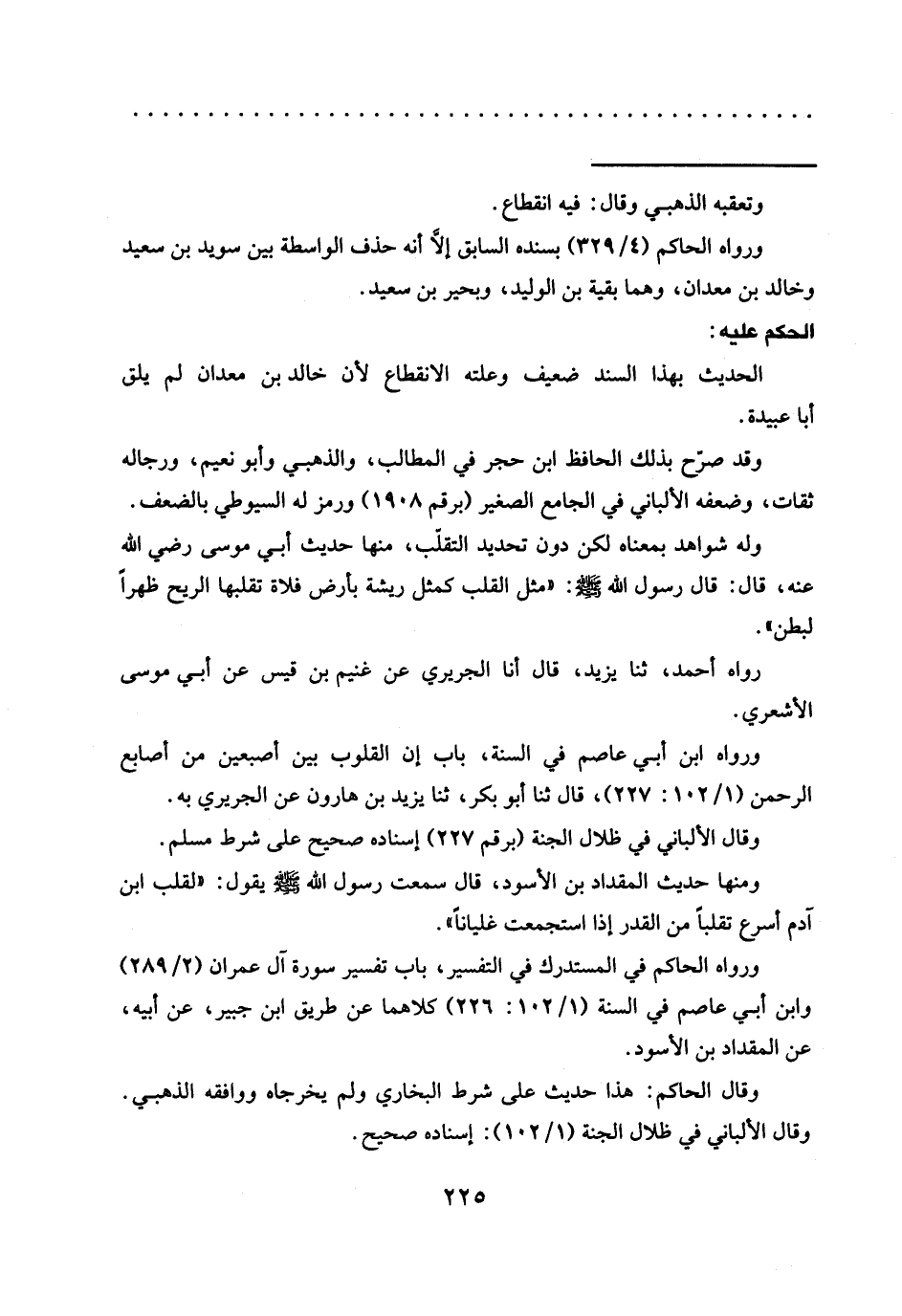 ومنها حديث المقداد بن الأسود، قال سمعت رسول الله -صلى الله عليه وسلم- يقول: "لقلب ابن آدم أسرع تقلبًا من القدر إذا استجمعت غليانًا.