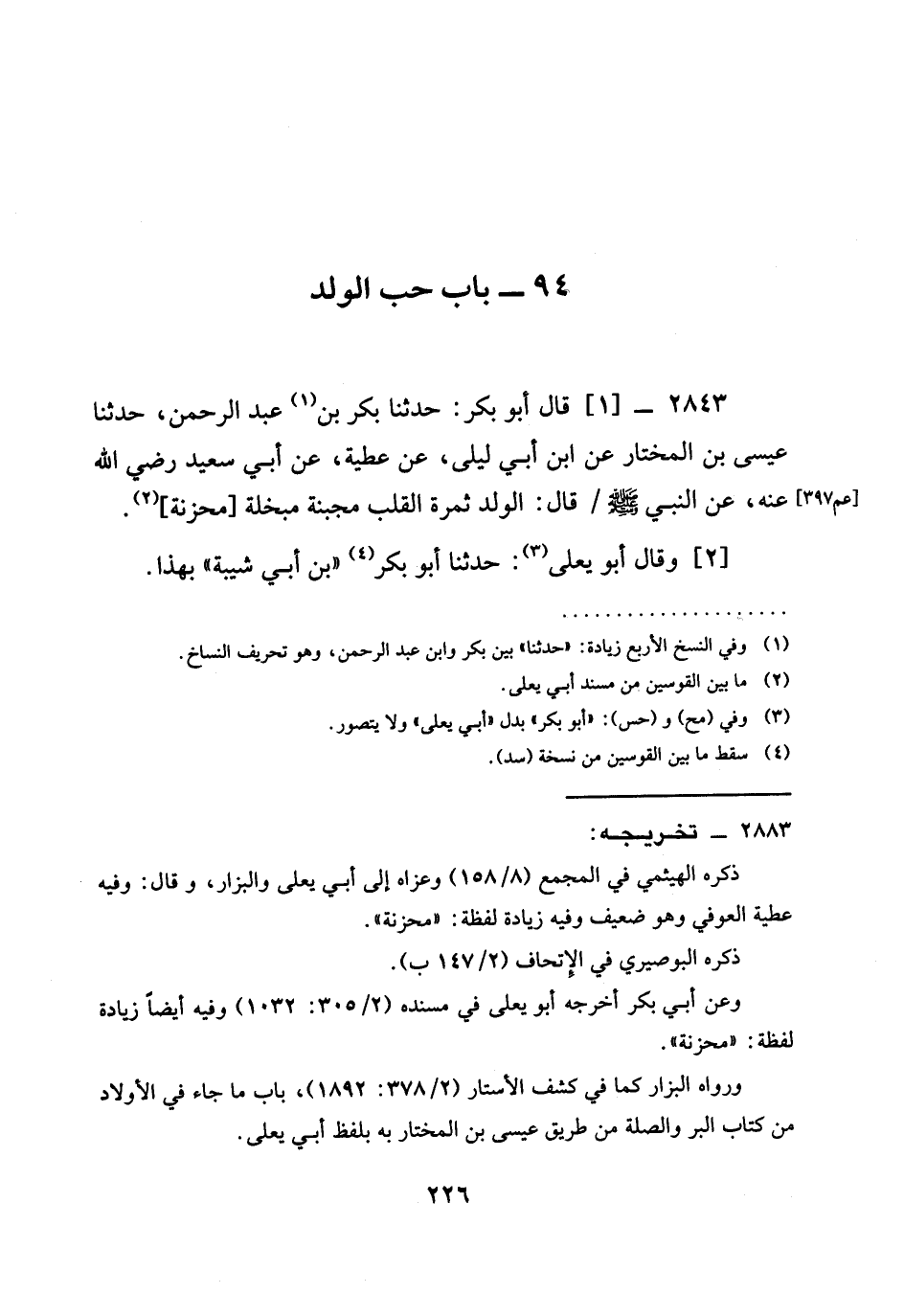 2843 -[1] قَالَ أَبُو بَكْرٍ: حَدَّثَنَا بَكْرُ بْنُ عَبْدِ الرَّحْمَنِ، حدثنا عِيسَى بْنُ الْمُخْتَارِ عَنِ ابْنِ أَبِي لَيْلَى، عَنْ عَطِيَّةَ، عَنْ أَبِي سعيد رَضِيَ الله عَنْه عن النبي صَلَّى اللَّهُ عَلَيْهِ وَسَلَّمَ / قَالَ: §الْوَلَدُ ثَمَرَةُ الْقَلْبِ مجبنة مبخلة [محزنة] .