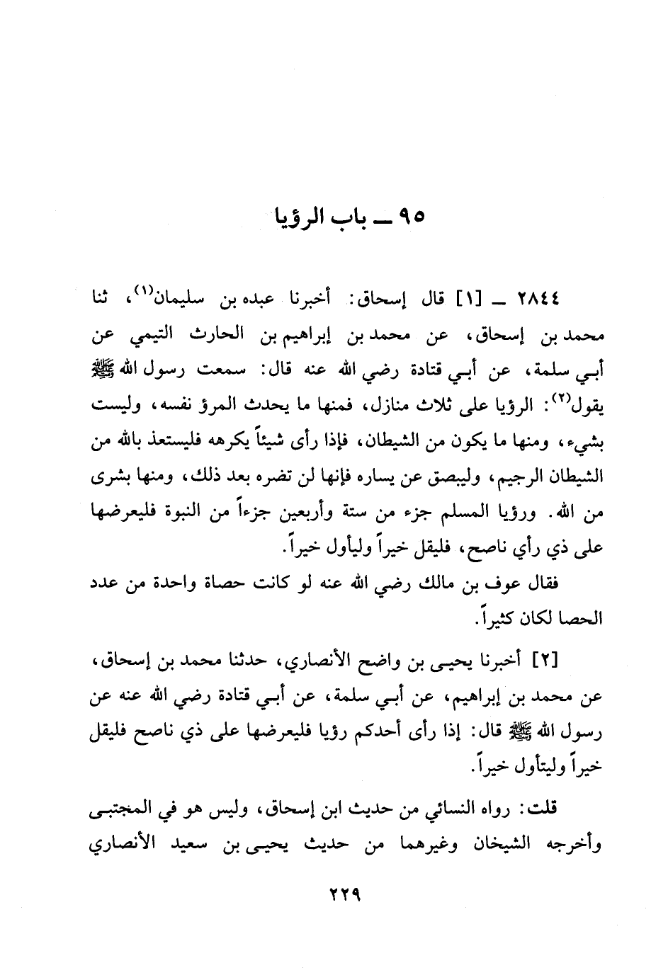 2844 -[1] قَالَ إِسْحَاقُ: أَخْبَرَنَا عَبْدَةُ بْنُ سُلَيْمَانَ، ثنا مُحَمَّدُ بْنُ إِسْحَاقَ، عَنْ مُحَمَّدِ بْنِ إِبْرَاهِيمَ بْنِ الْحَارِثِ التَّيْمِيِّ عَنْ أَبِي سَلَمَةَ، عَنْ أَبِي قَتَادَةَ رَضِيَ الله عَنْه قَالَ: سَمِعْتُ رَسُولَ اللَّهِ صَلَّى اللَّهُ عَلَيْهِ وَسَلَّمَ يَقُولُ: §الرؤيا على ثلاث مَنَازِلَ، فَمِنْهَا مَا يُحَدِّثُ المرؤ نَفْسَهُ، وَلَيْسَتْ بِشَيْءٍ، وَمِنْهَا مَا يَكُونُ مِنَ الشَّيْطَانِ، فَإِذَا رَأَى شَيْئًا يَكْرَهُهُ فَلْيَسْتَعِذْ بِاللَّهِ مِنَ الشَّيْطَانِ الرجيم، وليبصق عن يَسَارِهِ فَإِنَّهَا لَنْ تَضُرَّهُ بَعْدَ ذَلِكَ، وَمِنْهَا بُشْرَى مِنَ اللَّهِ. وَرُؤْيَا المسلم جُزْءٌ مِنْ سِتَّةٍ وَأَرْبَعِينَ جُزْءًا مِنَ النُّبُوَّةِ فَلْيَعْرِضْهَا عَلَى ذِي رَأْي نَاصِحٍ، فَلْيَقُلْ خَيْرًا وليأول خَيْرًا.