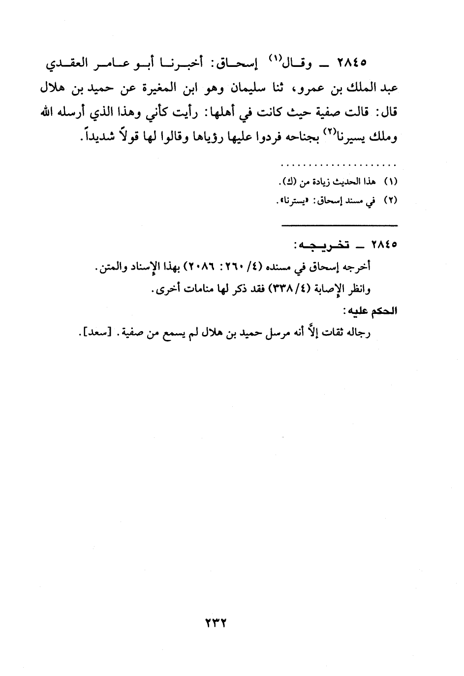 2845 - وَقَالَ إسحاق: أخبرنا أبو عامر الْعَقَدِيُّ عَبْدُ الْمَلِكِ بْنُ عَمْرٍو، ثنا سُلَيْمَانُ وهو ابْنُ الْمُغِيرَةِ عَنْ حُمَيْدِ بْنِ هِلَالٍ قَالَ: قَالَتْ صَفِيَّةُ حَيْثُ كَانَتْ فِي أَهْلِهَا: §رَأَيْتُ كَأَنِّي وَهَذَا الَّذِي أَرْسَلَهُ اللَّهُ وَمَلَكٌ يُسَيِّرُنَا بِجَنَاحِهِ فَرَدُّوا عَلَيْهَا رُؤْيَاهَا وَقَالُوا لَهَا قَوْلًا شَدِيدًا.