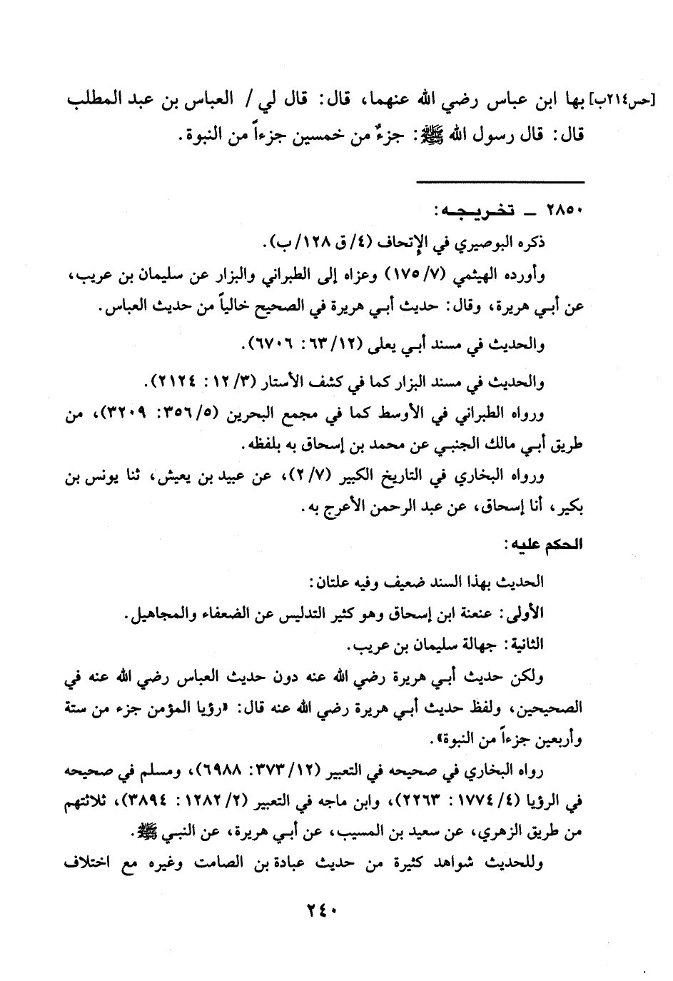 ولكن حديث أبي هريرة رضي الله عنه دون حديث العباس رضي الله عنه في الصحيحين، ولفظ حديث أبي هريرة رضي الله عنه قال: "رؤيا الْمُؤْمِنِ جُزْءٌ مِنْ سِتَّةٍ وَأَرْبَعِينَ جُزْءًا مِنَ النبوة".