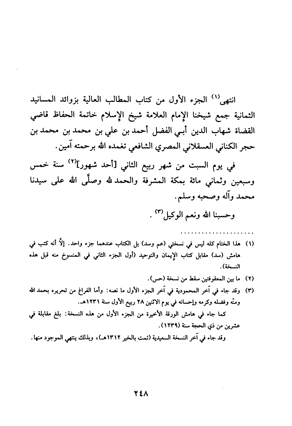 انتهى (¬1) الجزء الأوّل من كتاب المطالب العالية بزوائد المسانيد الثمانية جمع شيخنا الإمام العلامة شيخ الإِسلام خاتمة الحفاظ قاضي القضاة شهاب الدين أبي الفضل أحمد بن علي بن محمَّد بن محمَّد بن حجر الكناني العسقلاني المصري الشافعي تغمده الله برحمته آمين.