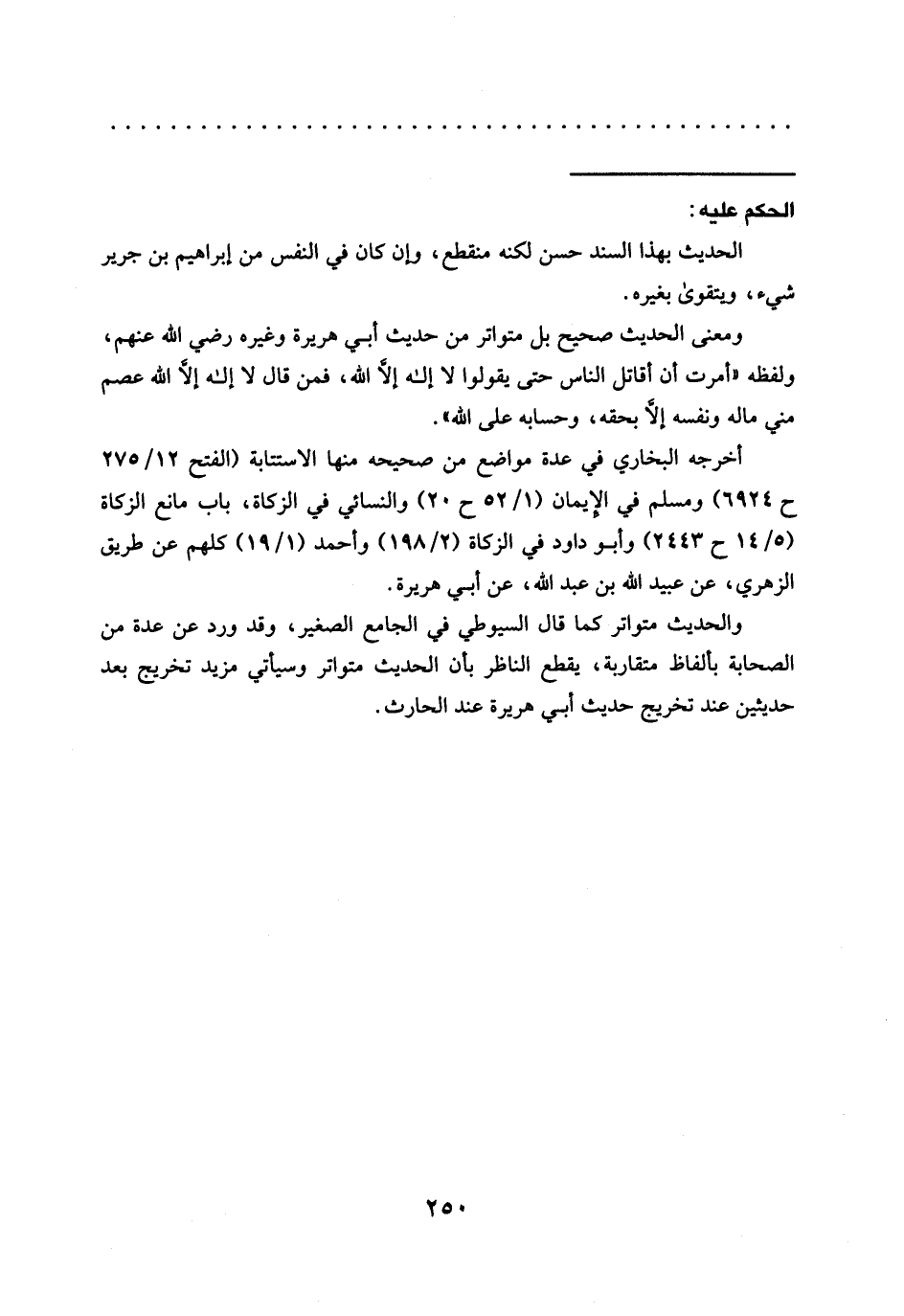 ومعنى الحديث صحيح بل متواتر من حديث أبي هريرة وغيره رضي الله عنهم، ولفظه "أمرت أَنْ أُقَاتِلَ النَّاسَ حَتَّى يَقُولُوا لَا إِلَهَ إلّا الله، فمن قال لا إله إلّا الله عصم مني ماله ونفسه إلّا بحقه، وحسابه على الله".