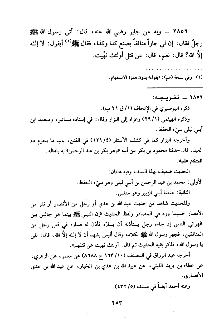 2856 - وَبِهِ عَنْ جَابِرٍ رَضِيَ الله عَنْه، قَالَ: أَتَى رَسُولَ اللَّهِ صَلَّى اللَّهُ عَلَيْهِ وَسَلَّمَ رَجُلٌ فَقَالَ: إِنَّ §لِي جَارًا مُنَافِقًا يَصْنَعُ كَذَا وَكَذَا، فَقَالَ صَلَّى اللَّهُ عَلَيْهِ وَسَلَّمَ أَيَقُولُ: لَا إِلَهَ إِلَّا اللَّهُ؟ قَالَ: نَعَمْ، قَالَ: عَنْ قَتْلِ أُولَئِكَ نُهِيتُ.