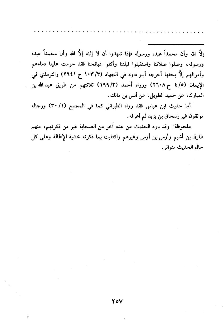 = إلّا الله وأن محمدا عبده ورسوله فإذا شهدوا أَنْ لَا إِلَهَ إِلَّا اللَّهُ وَأَنَّ مُحَمَّدًا عبده ورسوله، وصلوا صلاتنا واستقبلوا قبلتنا وأكلوا ذبائحنا فقد حرمت علينا دماءهم وأموالهم إلّا بحقها أخرجه أبو داود في الجهاد (3/ 103 ح 2641) والترمذي في الإيمان (5/ 4 ح 2608) ورواه أحمد (3/ 199) ثلاثتهم من طريق عبد الله بن المبارك، عن حميد الطويل، عن أنس بن مالك.