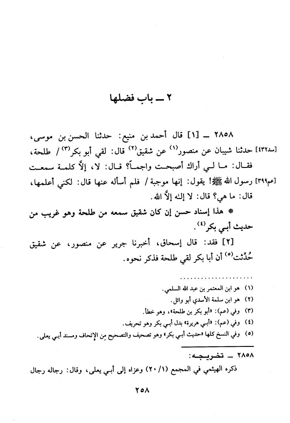 2858 -[1] قَالَ أَحْمَدُ بْنُ مَنِيعٍ: حَدَّثَنَا الْحَسَنُ بْنُ مُوسَى، حدثنا شَيْبَانُ عَنْ مَنْصُورٍ عَنْ شَقِيقٍ قال: لقي أَبُو بَكْرٍ / طَلْحَةَ،
