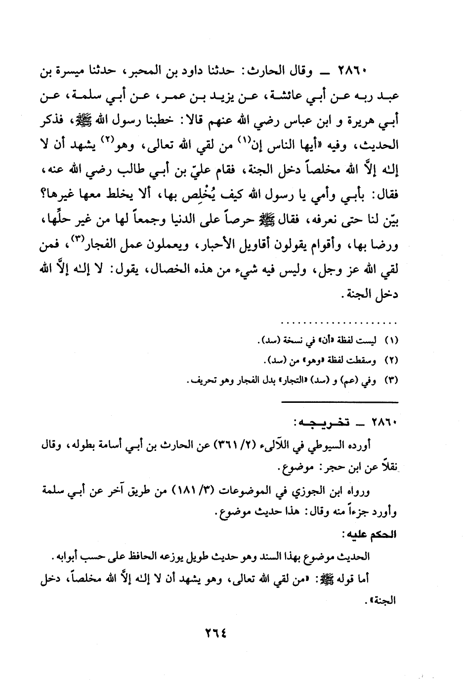 2860 - وقال الْحَارِثُ: حَدَّثَنَا دَاوُدُ بْنُ الْمُحَبَّرِ، حدثنا مَيْسَرَةُ بْنُ عَبْدِ رَبِّهِ عَنْ أَبِي عَائِشَةَ، عَنْ يزيد بن عمر، عَنْ أَبِي سَلَمَةَ، عَنْ أَبِي هُرَيْرَةَ وابن عباس رَضِيَ الله عَنْهم قَالَا: خَطَبَنَا رَسُولُ اللَّهِ صَلَّى اللَّهُ عَلَيْهِ وَسَلَّمَ، فَذَكَرَ الْحَدِيثَ، وَفِيهِ " أَيُّهَا الناس إن §مَنْ لقي الله تعالى، وَهُوَ يَشْهَدُ أَنْ لَا إِلَهَ إِلَّا اللَّهُ مُخْلِصًا دَخَلَ الْجَنَّةَ، فَقَامَ عَلِيُّ بْنُ أَبِي طَالِبٍ رَضِيَ الله عَنْه، فَقَالَ: بِأَبِي وَأُمِّي يَا رَسُولَ اللَّهِ كَيْفَ يُخْلِصُ بِهَا، أَلَّا يخلط معها غيرها؟ بَيِّنْ لَنَا حَتَّى نَعْرِفَهُ، فَقَالَ صَلَّى اللَّهُ عَلَيْهِ وَسَلَّمَ حِرْصًا عَلَى الدُّنْيَا وَجَمْعًا لَهَا من غير حلها، وَرِضًا بِهَا، وَأَقْوَامٌ يَقُولُونَ أَقَاوِيلَ الأحبار، وَيَعْمَلُونَ عَمَلَ الْفُجَّارِ، فَمَنْ لقي الله عز وجل، وليس فيه شيء مِنْ هَذِهِ الْخِصَالِ، يَقُولُ: لَا إِلَهَ إِلَّا اللَّهُ دَخَلَ الْجَنَّةَ.