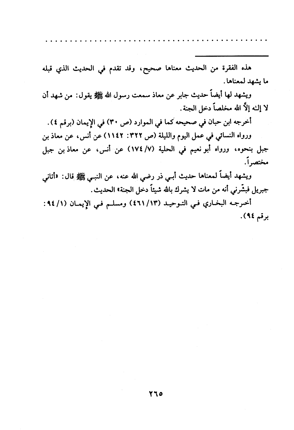 ويشهد أيضًا لمعناها حديث أبي ذر رضي الله عنه، عَنِ النَّبِيِّ -صَلَّى اللَّهُ عَلَيْهِ وَسَلَّمَ- قَالَ: "أتاني جبريل فبشّرني أنه من مات لا يشرك بالله شيئًا دخل الجنة" الحديث.