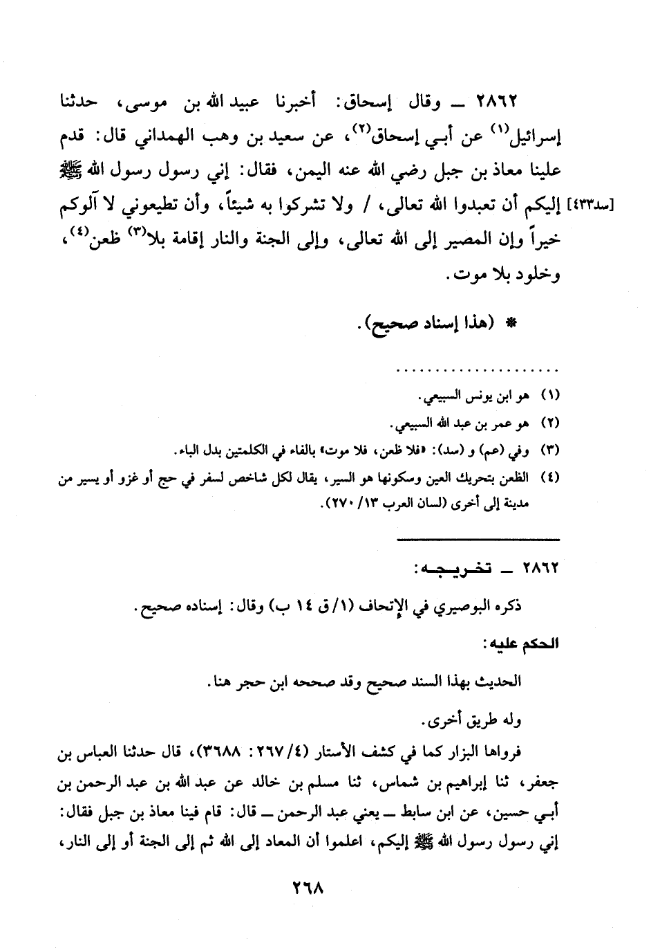 2862 - وقال إِسْحَاقُ: أَخْبَرَنَا عُبَيْدُ اللَّهِ بن موسى، حدثنا إِسْرَائِيلُ عَنْ أَبِي إسحاق، عن سعيد بْنِ وَهْبٍ الْهَمْدَانِيِّ قَالَ: قَدِمَ عَلَيْنَا مُعَاذُ بْنُ جَبَلٍ رَضِيَ الله عَنْه اليمن، فقال: §إني رَسُولُ رَسُولِ اللَّهِ صَلَّى اللَّهُ عَلَيْهِ وَسَلَّمَ إِلَيْكُمْ أَنْ تعبدوا الله تعالى، / وَلَا تُشْرِكُوا بِهِ شَيْئًا، وَأَنْ تُطِيعُونِي لَا آلُوكُمْ خَيْرًا وَأَنَّ الْمَصِيرَ إلى الله تعالى، وإلى الْجَنَّةِ وَالنَّارِ إقامة بلا ظَعْنٌ وَخُلُودٌ بِلَا مَوْتٍ.