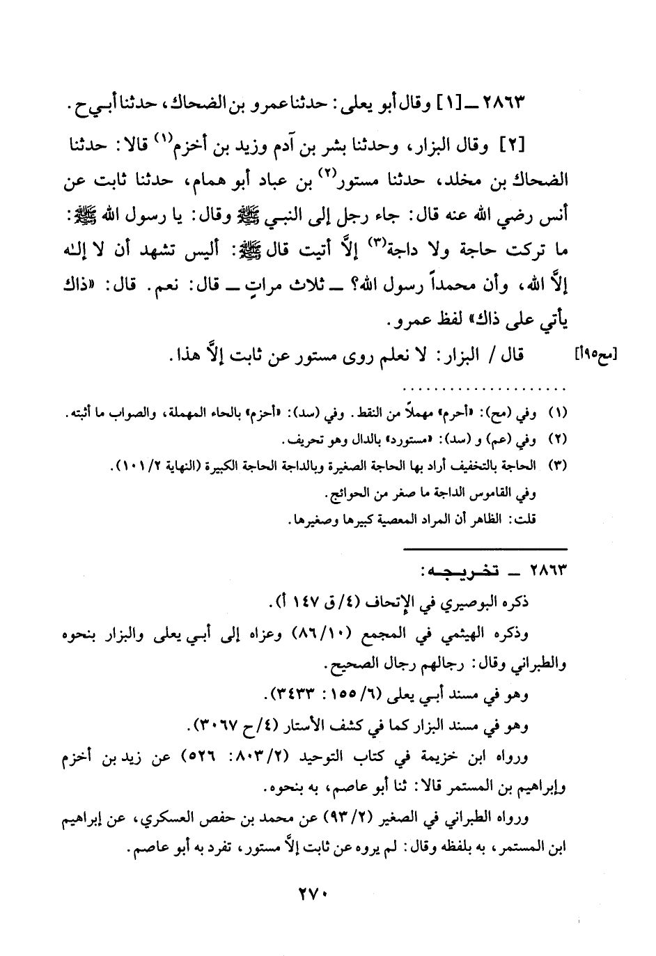 [2] وقال البزار، وحدثنا بشر بن آدم وزيد بن أخزم قالا: حدثنا الضحاك بن مخلد، حدثنا مُسْتُورُ بْنُ عَبَّادٍ أَبُو هَمَّامٍ، حدثنا ثَابِتٌ عن أنس رَضِيَ الله عَنْه قال: جَاءَ رجل إلى النبي صَلَّى اللَّهُ عَلَيْهِ وَسَلَّمَ وقال: يَا رَسُولَ اللَّهِ صَلَّى اللَّهُ عَلَيْهِ وَسَلَّمَ: §مَا تَرَكْتُ حَاجَةً وَلَا دَاجَةً إِلَّا أَتَيْتُ قَالَ صَلَّى اللَّهُ عَلَيْهِ وَسَلَّمَ: أَلَيْسَ تَشْهَدُ أَنْ لَا إِلَهَ إِلَّا اللَّهُ، وَأَنَّ مُحَمَّدًا رَسُولُ اللَّهِ؟ - ثَلَاثَ مَرَّاتٍ - قَالَ: نَعَمْ. قَالَ: " ذَاكَ يأتي على ذاك " لفظ عمرو.