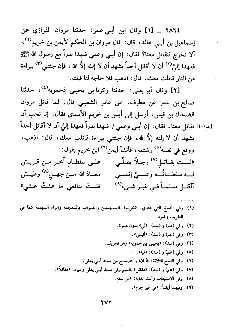 2864 -[1] وَقَالَ ابن أبي عمر: حدثنا مَرْوَانُ الفزازي عَنْ إِسْمَاعِيلَ بْنِ أَبِي خالد، قال: قَالَ مَرْوَانُ بْنُ الْحَكَمِ لأيمن بن خريم، أَلَا تَخْرُجُ فَتُقَاتِلُ مَعَنَا؟ فَقَالَ: إِنَّ أَبِي وَعَمِّي شَهِدَا بَدْرًا مَعَ رَسُولِ اللَّهِ صَلَّى اللَّهُ عَلَيْهِ وَسَلَّمَ فَعَهِدَا إِلَيَّ أَنْ §لَا أقاتل أحداً يشهد أَنْ لَا إِلَهَ إِلَّا اللَّهُ، فَإِنْ جِئْتَنِي بِبَرَاءَةٍ مِنَ النَّارِ قَاتَلْتُ مَعَكَ، قَالَ: اذْهَبْ فَلَا حاجة لنا فيك.
