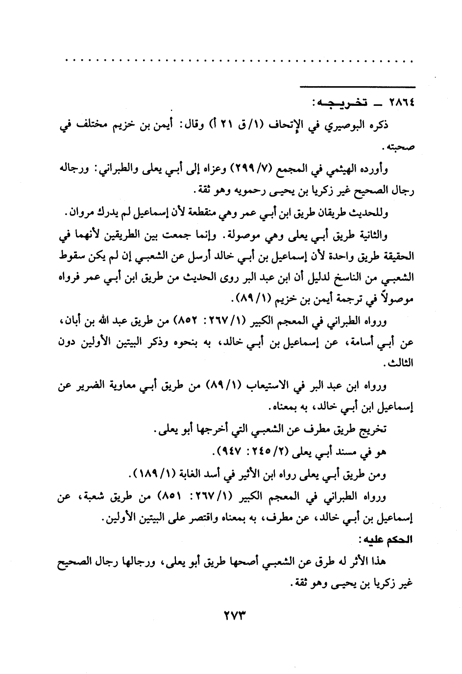 والثانية طريق أبي يعلى وهي موصولة. وإنما جمعت بين الطريقين لأنهما في الحقيقة طريق واحدة لأنّ إسماعيل بن أبي خالد أرسل عن الشعبي إن لم يكن سقوط الشعبي من الناسخ لدليل أن ابن عبد البر روى الحديث من طريق ابن أبي عمر فرواه موصولًا في ترجمة أيمن بن خزيم (1/ 89).