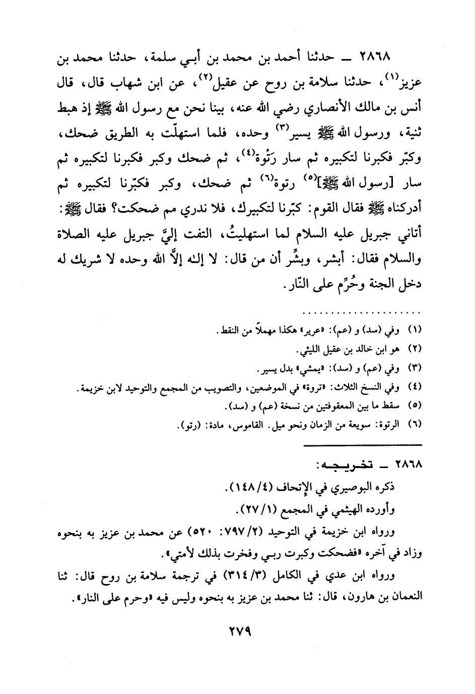 2868 - حدثنا أَحْمَدُ بْنُ مُحَمَّدِ بْنِ أَبِي سَلَمَةَ، حدثنا مُحَمَّدُ بْنُ عَزِيزٍ، حدثنا سَلَامَةُ بْنُ رَوْحٍ عَنْ عَقِيلٍ، عَنِ ابْنِ شِهَابٍ قَالَ، قَالَ أَنَسُ بْنُ مَالِكٍ الْأَنْصَارِيُّ رَضِيَ الله عَنْه، بَيْنَا نَحْنُ مَعَ رَسُولِ اللَّهِ صَلَّى اللَّهُ عَلَيْهِ وَسَلَّمَ إِذْ هَبَطَ ثَنِيَّةً، وَرَسُولُ اللَّهِ صَلَّى اللَّهُ عَلَيْهِ وَسَلَّمَ يَسِيرُ وَحْدَهُ، فَلَمَّا اسْتَهَلَّتْ بِهِ الطَّرِيقُ ضَحِكَ، وَكَبَّرَ فكبرنا لتكبيره ثم سار رتوة، ثُمَّ ضَحِكَ وَكَبَّرَ فكبرنا لتكبيره ثم سار [رسول الله صَلَّى اللَّهُ عَلَيْهِ وَسَلَّمَ] رتوة ثُمَّ ضَحِكَ وَكَبَّرَ فكبرنا لِتَكْبِيرِهِ ثُمَّ أَدْرَكْنَاهُ صَلَّى اللَّهُ عَلَيْهِ وَسَلَّمَ فَقَالَ الْقَوْمُ: كبرنا لتكبيرك، فلا نَدْرِي مِمَّ ضحكت؟ فقال صَلَّى اللَّهُ عَلَيْهِ وَسَلَّمَ: أتاني جبريل عليه السلام لما استهليت، الْتَفَتَ إلي جبريل عليه الصلاة والسلام فَقَالَ: أبشر، وبشر أن §مَنْ قَالَ: لَا إِلَهَ إِلَّا اللَّهُ وَحْدَهُ لَا شَرِيكَ لَهُ دَخَلَ الْجَنَّةَ وحرم عَلَى النَّارِ.