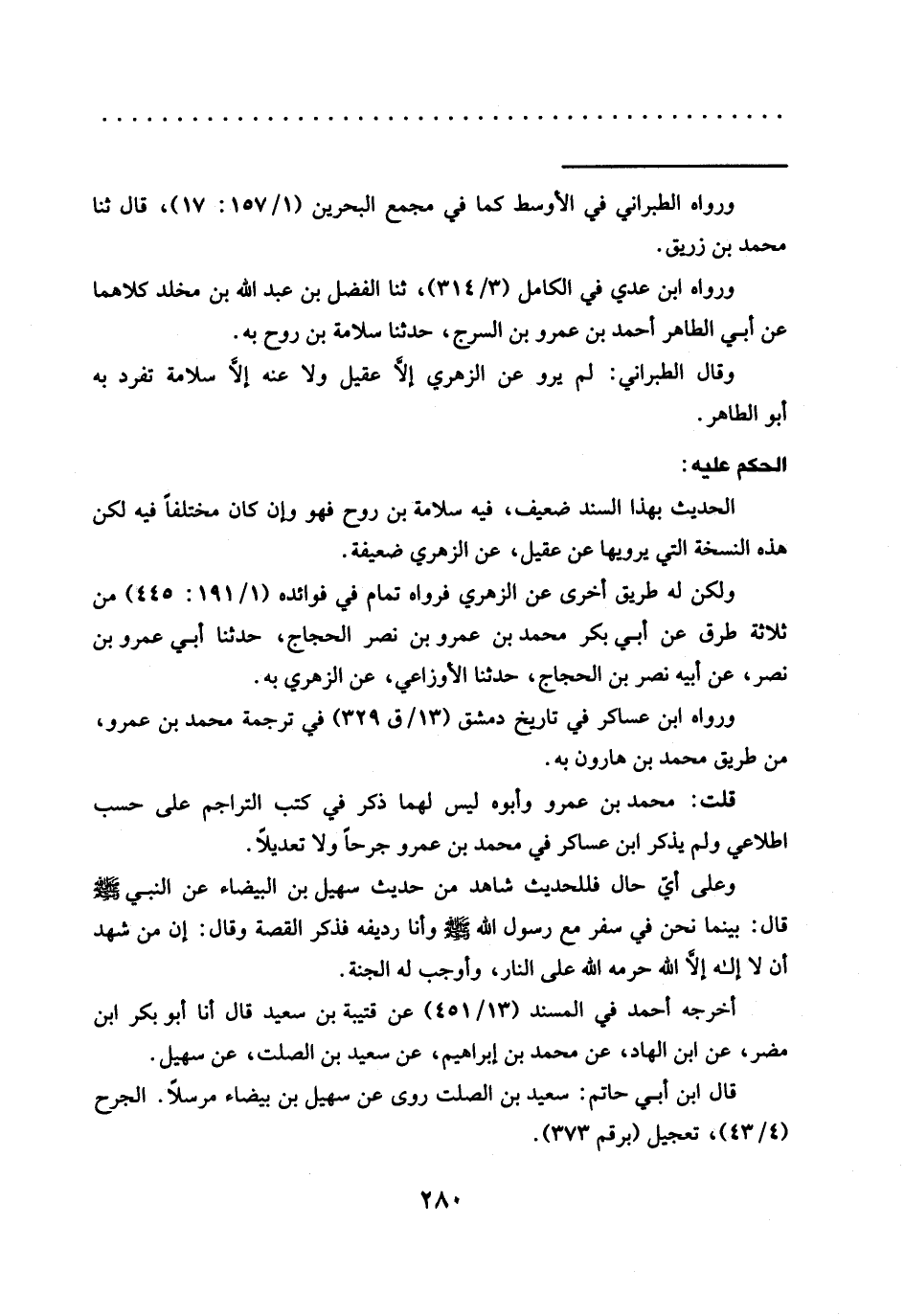 ورواه ابن عديّ في الكامل (3/ 314)، ثنا الفضل بن عبد الله بن مخلد كلاهما عن أبي الطاهر أحمد بن عمرو بن السرج، حدّثنا سلامة بن روح به.