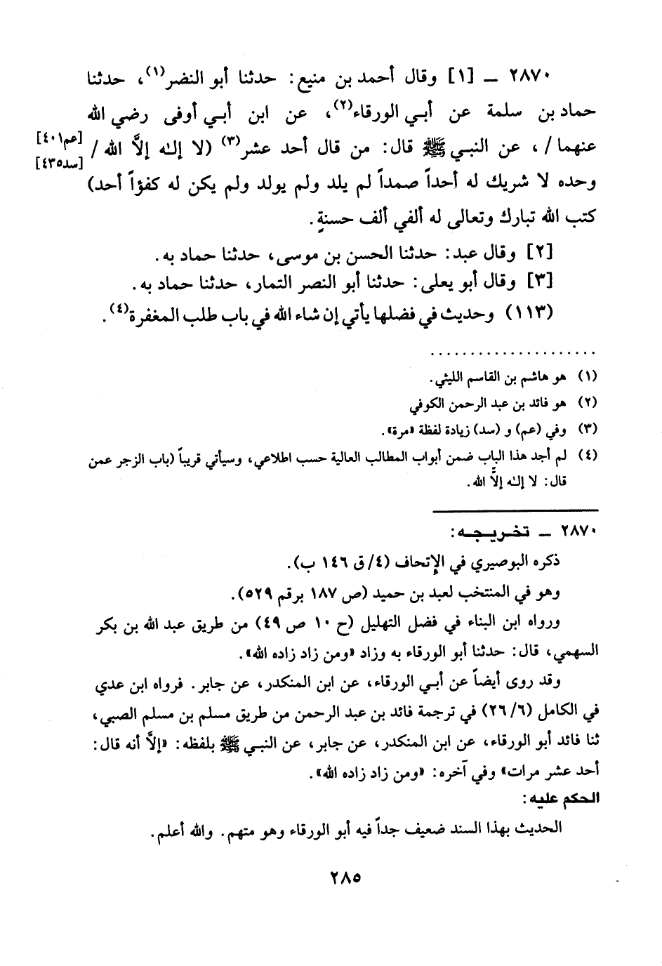 2870 -[1] وَقَالَ أَحْمَدُ بْنُ مَنِيعٍ: حدثنا أَبُو النَّضْرِ، حدثنا حَمَّادُ بْنُ سَلَمَةَ عَنْ أَبِي الْوَرْقَاءِ، عَنِ ابْنِ أبي أوفى رَضِيَ الله عَنْهما، / عَنِ النَّبِيِّ صَلَّى اللَّهُ عَلَيْهِ وَسَلَّمَ قَالَ: §مَنْ قَالَ أَحَدَ عَشَرَ (لَا إِلَهَ إِلَّا اللَّهُ / وَحْدَهُ لَا شريك له أحداً صمداً لَمْ يَلِدْ وَلَمْ يُولَدْ وَلَمْ يكن له كفؤاً أَحَدٌ) كتب الله تبارك وتعالى له أَلْفَيْ أَلْفِ حَسَنَةً.