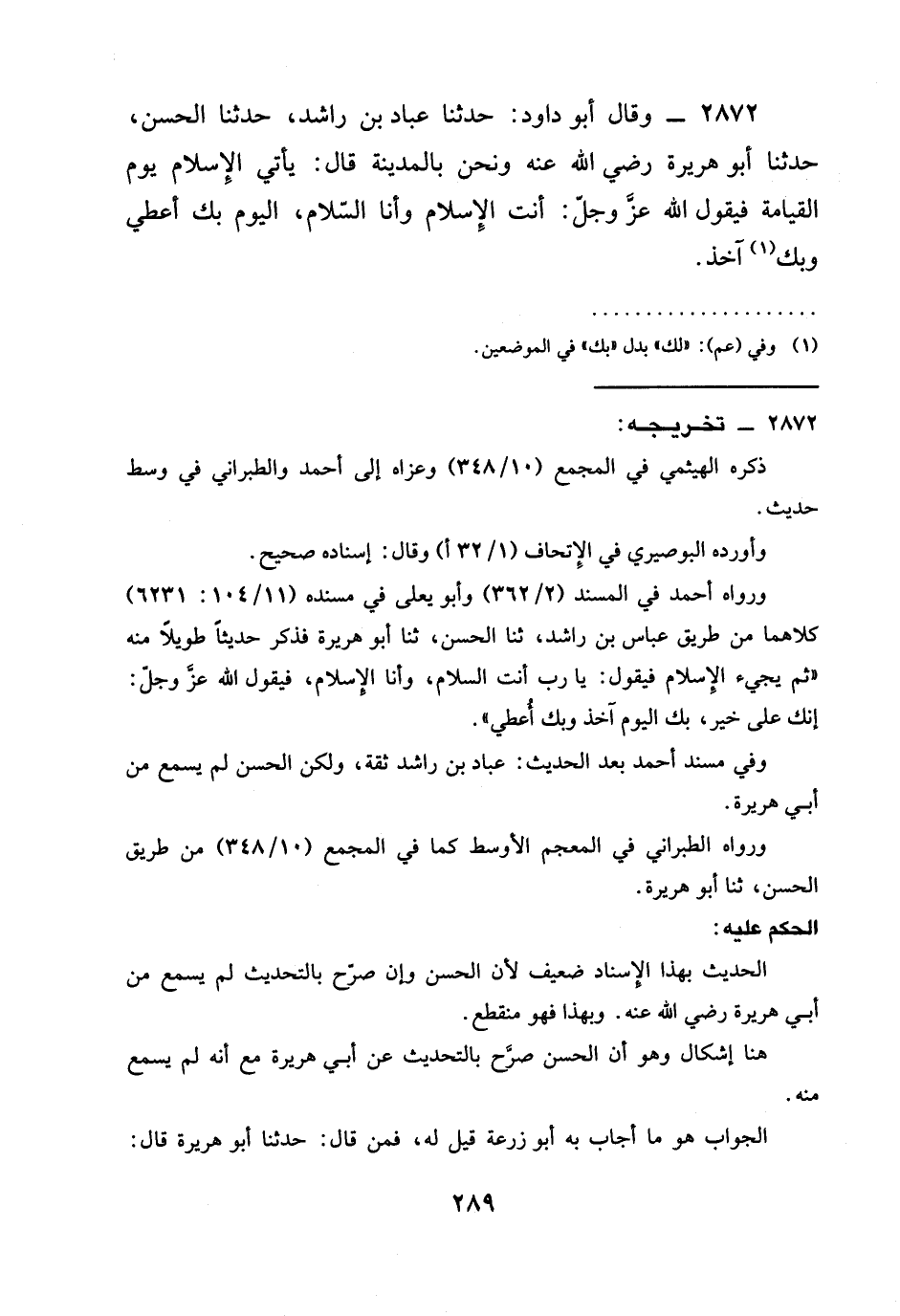 2872 - وقال أَبُو دَاوُدَ: حدثنا عَبَّادُ بْنُ رَاشِدٍ، حدثنا الْحَسَنُ حدثنا أَبُو هُرَيْرَةَ رَضِيَ الله عَنْه وَنَحْنُ بِالْمَدِينَةِ قَالَ: يَأْتِي الْإِسْلَامُ يَوْمَ الْقِيَامَةِ فَيَقُولُ اللَّهُ عَزَّ وَجَلَّ: §أَنْتَ الْإِسْلَامُ وَأَنَا السَّلَامُ، الْيَوْمَ بِكَ أُعْطِي وَبِكَ آخُذُ.