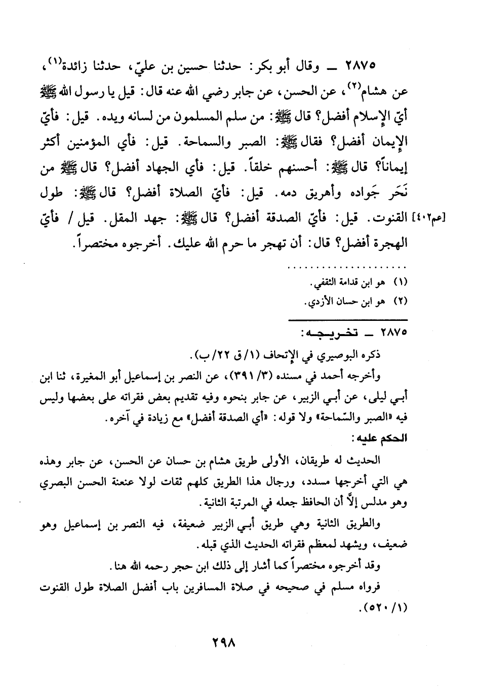 2875 - وقال أَبُو بَكْرٍ: حَدَّثَنَا حُسَيْنُ بْنُ عَلِيٍّ، حدثنا زَائِدَةُ، عَنْ هِشَامٍ، عَنِ الْحَسَنِ، عَنْ جَابِرٍ رَضِيَ الله عَنْه قال: قيل: يا رَسُولُ اللَّهِ صَلَّى اللَّهُ عَلَيْهِ وَسَلَّمَ §أَيُّ الْإِسْلَامِ أَفْضَلُ؟ قَالَ صَلَّى اللَّهُ عَلَيْهِ وَسَلَّمَ: مَنْ سَلِمَ الْمُسْلِمُونَ مِنْ لِسَانِهِ وَيَدِهِ. قيل: فَأَيُّ الإيمان أفضل؟ فقال صَلَّى اللَّهُ عَلَيْهِ وَسَلَّمَ: الصَّبْرُ وَالسَّمَاحَةُ. قيل: فَأَيُّ الْمُؤْمِنِينَ أَكْثَرُ إِيمَانًا؟ قَالَ صَلَّى اللَّهُ عَلَيْهِ وَسَلَّمَ: أَحْسَنُهُمْ خُلُقًا. قيل: فأي الجهاد أفضل؟ قال صَلَّى اللَّهُ عَلَيْهِ وَسَلَّمَ من نحر جواده وأهريق دمه. قيل: فَأَيُّ الصَّلَاةِ أَفْضَلُ؟ قَالَ صَلَّى اللَّهُ عَلَيْهِ وَسَلَّمَ: طُولُ الْقُنُوتِ. قيل: فأي الصَّدَقَةِ أَفْضَلُ؟ قَالَ صَلَّى اللَّهُ عَلَيْهِ وَسَلَّمَ: جَهْدُ الْمُقِلِّ. قِيلَ / فَأَيُّ الْهِجْرَةِ أَفْضَلُ؟ قَالَ: أَنْ تَهْجُرَ مَا حَرَّمَ اللَّهُ عَلَيْكَ. أَخْرَجُوهُ مُخْتَصَرًا.