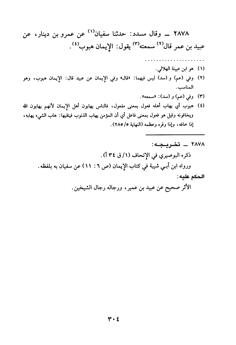 2878 - وقال مسدد: حدثنا سفيان عن عمرو بن دينار، عن عبيد بن عمر قال سمعته يقول: الإيمان هيوب.