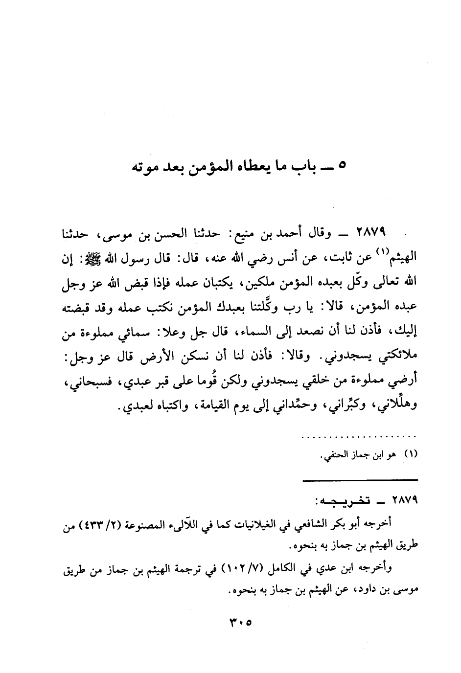 2879 - وقال أَحْمَدُ بْنُ منيع: حدثنا الحسن بْنُ مُوسَى، حدثنا الْهَيْثَمُ عَنْ ثَابِتٍ، عَنْ أَنَسٍ رَضِيَ الله عَنْه، قَالَ: قَالَ رَسُولُ اللَّهِ صَلَّى اللَّهُ عَلَيْهِ وَسَلَّمَ: إن الله تعالى وَكَّلَ بِعَبْدِهِ الْمُؤْمِنِ مَلَكَيْنِ، يَكْتُبَانِ عَمَلَهُ §فَإِذَا قبض الله عز وجل عَبْدَهُ الْمُؤْمِنَ، قَالَا: يَا رَبُّ وَكَّلْتَنَا بِعَبْدِكَ الْمُؤْمِنِ نَكْتُبُ عَمَلَهُ وقد قبضته إليك، فَأْذَنْ لَنَا أَنْ نَصْعَدَ إِلَى السماء، قال جل وعلا: سَمَائِي مَمْلُوءَةٌ من ملائكتي يسجدوني. وقالا: فأذن لَنَا أَنْ نَسْكُنَ الأرض قال عز وجل: أَرْضِي مَمْلُوءَةٌ مِنْ خَلْقِي يسجدوني وَلَكِنْ قُومَا عَلَى قَبْرِ عَبْدِي، فَسَبِّحَانِي، وَهَلِّلَانِي، وَكَبِّرَانِي، وحمداني إِلَى يَوْمِ الْقِيَامَةِ، واكتباه لِعَبْدِي.