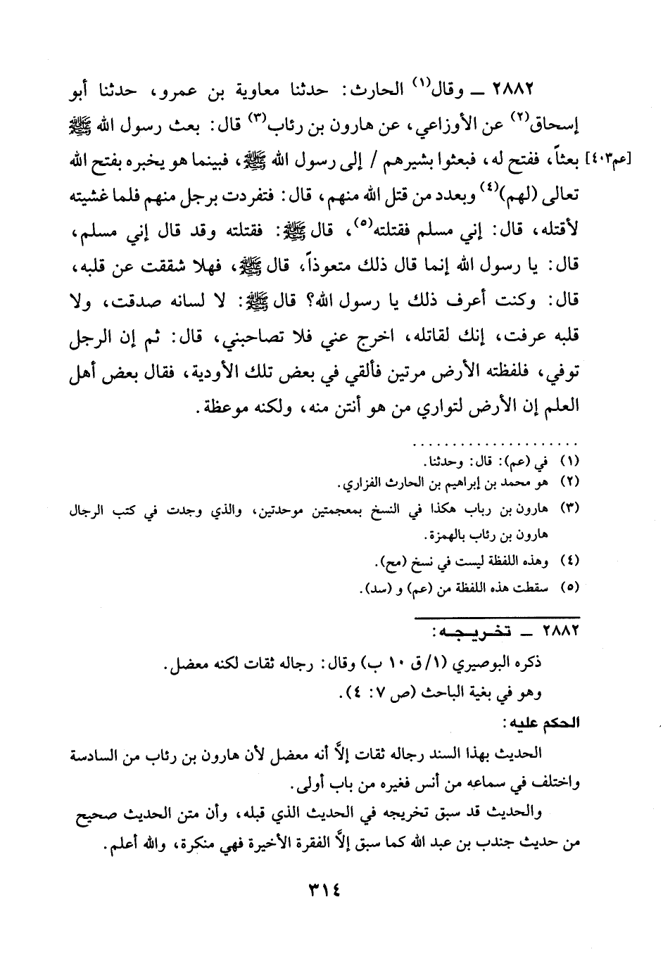 2882 - وقال الْحَارِثُ: حَدَّثَنَا معاوية بن عمرو، حدثنا أَبُو إِسْحَاقَ عَنِ الْأَوْزَاعِيِّ، عَنْ هَارُونَ بن رئاب قال: بَعَثَ رَسُولُ اللَّهِ صَلَّى اللَّهُ عَلَيْهِ وَسَلَّمَ بعثاً، ففتح له، فَبَعَثُوا بَشِيرَهُمْ / إِلَى رَسُولِ اللَّهِ صَلَّى اللَّهُ عَلَيْهِ وَسَلَّمَ، فَبَيْنَمَا هُوَ يُخْبِرُهُ بفتح الله تعالى (لَهُمْ) وَبِعَدَدِ مَنْ قَتَلَ اللَّهُ مِنْهُمْ، قَالَ: فَتَفَرَّدْتُ بِرَجُلٍ مِنْهُمْ فَلَمَّا غَشِيتُهُ لِأَقْتُلَهُ، قَالَ: إِنِّي مُسْلِمٌ فقتلته، قَالَ صَلَّى اللَّهُ عَلَيْهِ وَسَلَّمَ: فَقَتَلْتُهُ وقد قال إني مُسْلِمٌ، قَالَ: يَا رَسُولَ اللَّهِ إِنَّمَا قال ذلك مُتَعَوِّذًا، قَالَ صَلَّى اللَّهُ عَلَيْهِ وَسَلَّمَ، §فَهَلَّا شَقَقْتَ عَنْ قَلْبِهِ، قَالَ: وَكُنْتُ أَعْرِفُ ذَلِكَ يَا رَسُولَ اللَّهِ؟ قال صَلَّى اللَّهُ عَلَيْهِ وَسَلَّمَ: لا لِسَانَهُ صَدَّقْتَ، وَلَا قَلْبَهُ عَرَفْتَ، إِنَّكَ لَقَاتِلُهُ، اخْرُجْ عَنِّي فَلَا تُصَاحِبْنِي، قَالَ: ثُمَّ إِنَّ الرَّجُلَ تُوُفِّيَ، فَلَفَظَتْهُ الْأَرْضُ مَرَّتَيْنِ فألقي فِي بَعْضِ تِلْكَ الْأَوْدِيَةِ، فَقَالَ بَعْضُ أَهْلِ الْعِلْمِ إِنَّ الْأَرْضَ لَتُوَارِي مَنْ هو أنتن منه، وَلَكِنَّهُ مَوْعِظَةٌ.