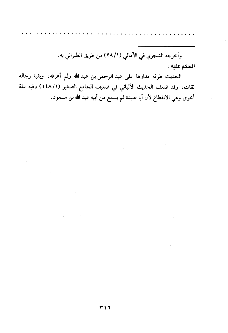 الحديث طرقه مدارها على عبد الرحمن بن عبد الله ولم أعرفه، وبقية رجاله ثقات، وقد ضعف الحديث الألباني في ضعيف الجامع الصغير (1/ 148) وفيه علة أخرج وهي الانقطاع لأنّ أبا عبيدة لم يسمع من أبيه عبد الله بن مسعود.