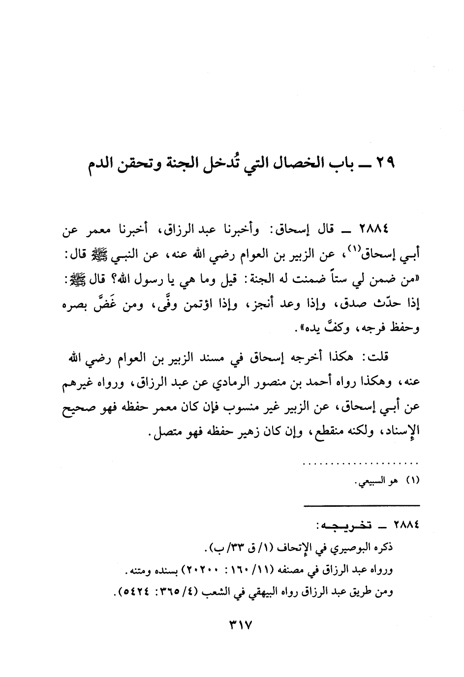 2884 - قَالَ إِسْحَاقُ: وأخبرنا عبد الرزاق، أخبرنا مَعْمَرٌ عَنْ أَبِي إِسْحَاقَ، عَنِ الزُّبَيْرِ بْنِ الْعَوَّامِ رَضِيَ الله عَنْه، عَنِ النَّبِيِّ صَلَّى اللَّهُ عَلَيْهِ وَسَلَّمَ قَالَ: " §مَنْ ضَمِنَ لِي سِتًّا ضَمِنْتُ لَهُ الْجَنَّةَ: قِيلَ وَمَا هِيَ يَا رَسُولَ اللَّهِ؟ قَالَ صَلَّى اللَّهُ عَلَيْهِ وَسَلَّمَ: إِذَا حَدَّثَ صَدَقَ، وَإِذَا وَعَدَ أَنْجَزَ، وإذا اؤتمن وفى، وَمَنْ غَضَّ بَصَرَهُ وَحَفِظَ فَرْجَهُ، وكف يده ".