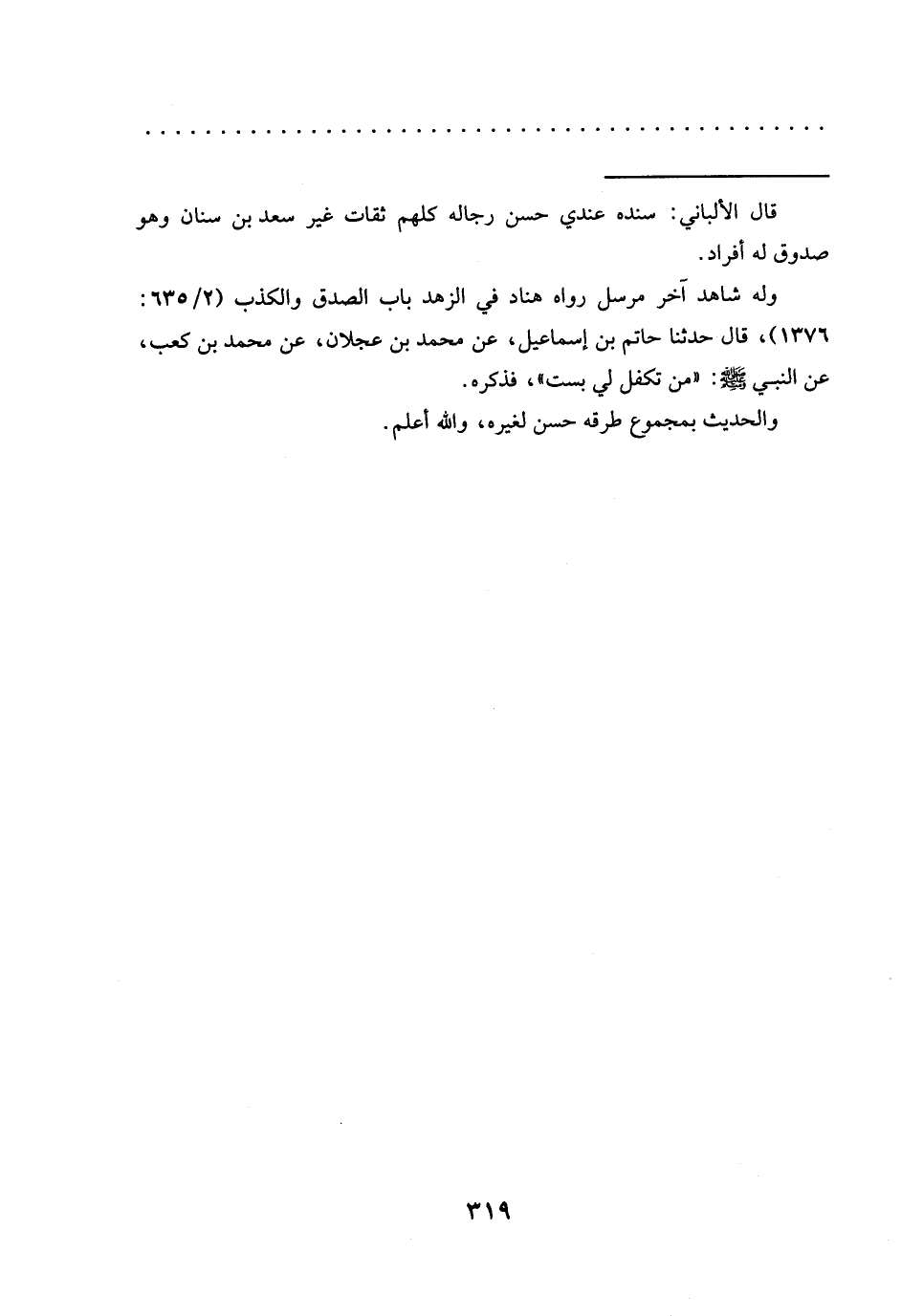 وله شاهد آخر مرسل رواه هناد في الزهد باب الصدق والكذب (2/ 635: 1376)، قال حدّثنا حاتم بن إسماعيل، عن محمَّد بن عجلان، عن محمَّد بن كعب، عَنِ النَّبِيِّ -صَلَّى اللَّهُ عَلَيْهِ وَسَلَّمَ-: "مَنْ تكفل لي بست"، فذكره.