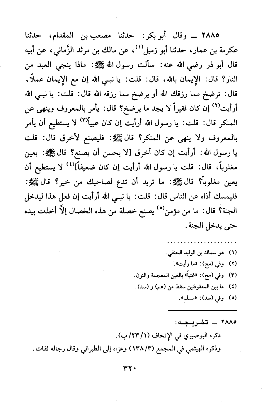 2885 - وقال أَبُو بَكْرٍ: حدثنا مُصْعَبُ بْنُ الْمِقْدَامِ، حدثنا عِكْرِمَةُ بْنُ عَمَّارٍ، حدثنا أَبُو زُمَيْلٍ، عَنْ مَالِكِ بن مرثد الزماني، عَنْ أَبِيهِ قَالَ أَبُو ذَرٍّ رَضِيَ الله عَنْه: سَأَلْتُ رَسُولَ اللَّهِ صَلَّى اللَّهُ عَلَيْهِ وَسَلَّمَ: §مَاذَا يُنْجِي الْعَبْدَ مِنَ النَّارِ؟ قَالَ: الإيمان بِاللَّهِ، قَالَ: قُلْتُ: يَا نَبِيَّ اللَّهِ إِنَّ مَعَ الْإِيمَانِ عَمَلًا، قَالَ: تُرْضَخُ مِمَّا رَزَقَكَ اللَّهُ أَوْ يُرْضَخُ مِمَّا رَزَقَهُ اللَّهُ قَالَ: قُلْتُ: يَا نَبِيَّ اللَّهِ أَرَأَيْتَ إِنْ كَانَ فَقِيرًا لَا يَجِدُ مَا يُرْضَخُ؟ قَالَ: يَأْمُرُ بِالْمَعْرُوفِ وَيَنْهَى عَنِ الْمُنْكَرِ قَالَ: قُلْتُ: يَا رَسُولَ اللَّهِ أَرَأَيْتَ إِنْ كَانَ عَيِيًّا لَا يَسْتَطِيعُ أَنْ يَأْمُرَ بِالْمَعْرُوفِ وَلَا يَنْهَى عَنِ الْمُنْكَرِ؟ قَالَ صَلَّى اللَّهُ عَلَيْهِ وَسَلَّمَ: فَلْيَصْنَعْ لِأَخْرَقَ قَالَ: قُلْتُ يَا رسول الله: أرأيت إن كان أَخْرَقَ [لا يحسن أن يَصْنَعَ؟ قَالَ صَلَّى اللَّهُ عَلَيْهِ وَسَلَّمَ: يُعِينُ مَغْلُوبًا، قَالَ: قُلْتُ يَا رَسُولَ اللَّهِ أَرَأَيْتَ إِنْ كَانَ ضَعِيفًا] لَا يَسْتَطِيعُ أَنْ يُعِينَ مَغْلُوبًا؟ قَالَ صَلَّى اللَّهُ عَلَيْهِ وَسَلَّمَ: مَا تُرِيدُ أَنْ تَدَعَ لِصَاحِبِكَ مِنْ خَيْرٍ؟ قَالَ صَلَّى اللَّهُ عَلَيْهِ وَسَلَّمَ: فَلْيُمْسِكْ أَذَاهُ عَنِ النَّاسِ قَالَ: قلت: يا نبي اللَّهِ أَرَأَيْتَ إِنْ فَعَلَ هَذَا ليدخل الْجَنَّةَ؟ قَالَ: مَا مِنْ مُؤْمِنٍ يَصْنَعُ خَصْلَةً مِنْ هَذِهِ الْخِصَالِ إِلَّا أَخَذَتْ بيده حتى يدخل الْجَنَّةَ.
