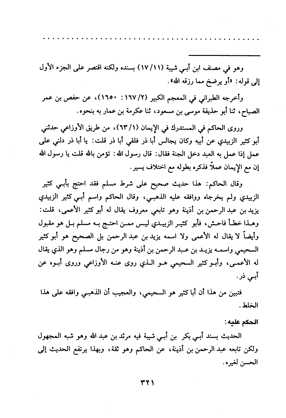 وقال الحاكم: هذا حديث صحيح على شرط مسلم فقد احتج بأبي كثير الزبيدي ولم يخرجاه ووافقه عليه الذهبي، وقال الحاكم واسم أبي كثير الزبيدي يزيد بن عبد الرحمن بن أذينة وهو تابعي معروف يقال له أبو كثير الأعمى، قلت: وهذا خطا فاحش، فأبو كثير الزبيدي ليس ممن احتج به مسلم بل هو مقبول وأيضًا لا يقال له الأعمى ولا اسمه يزيد بن عبد الرحمن بل الصحيح هو أبو كثير السحيمي واسمه يزيد بن عبد الرحمن بن أذينة وهو من رجال مسلم وهو الذي يقال له الأعمى، وأبو كثير السحيمي هو الذي روى عنه الأوزاعي وروى أبوه عن أبي ذر.
