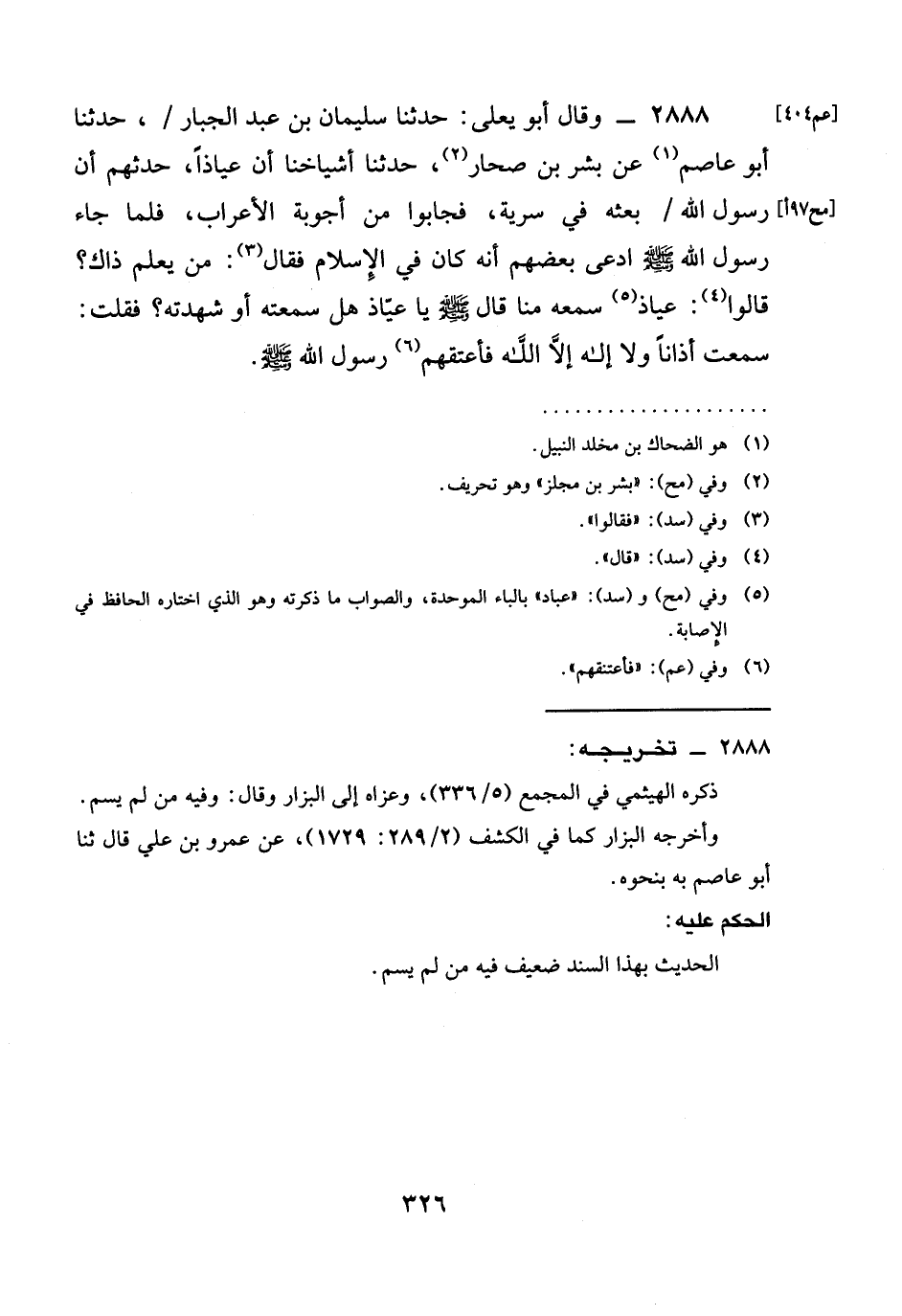 2888 - وقال أَبُو يَعْلَى: حدثنا سُلَيْمَانُ بْنُ عَبْدِ الْجَبَّارِ /، حَدَّثَنَا أَبُو عَاصِمٍ عَنْ بِشْرِ بْنِ صُحَارٍ، حَدَّثَنَا أَشْيَاخُنَا أَنَّ عَيَّاذًا، حَدَّثَهُمْ أَنَّ رَسُولَ اللَّهِ / بَعَثَهُ في سرية، فجابوا من أجوبة الْأَعْرَابِ، فَلَمَّا جَاءَ رَسُولُ اللَّهِ صَلَّى اللَّهُ عَلَيْهِ وَسَلَّمَ ادَّعَى بَعْضُهُمْ أَنَّهُ كَانَ فِي الْإِسْلَامِ فَقَالَ: من يعلم ذاك؟ قَالُوا: عَيَّاذٌ سَمِعَهُ مِنَّا قَالَ صَلَّى اللَّهُ عَلَيْهِ وَسَلَّمَ يَا عياذ §هل سمعته أو شهدته؟ فَقُلْتُ: سَمِعْتُ أَذَانًا ولا إِلَهَ إلا الله فأعتقهم رَسُولُ اللَّهِ صَلَّى اللَّهُ عَلَيْهِ وَسَلَّمَ.