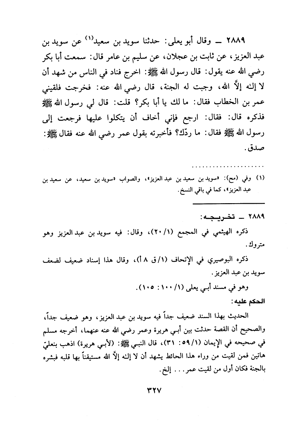 2889 - وقال أَبُو يَعْلَى: حدثنا سُوَيْدُ بْنُ سعيد عن سُوَيْدُ بْنُ عَبْدِ الْعَزِيزِ، عَنْ ثَابِتِ بْنِ عَجْلَانَ، عَنْ سُلَيْمِ بْنِ عامر قال: سَمِعْتُ أَبَا بَكْرٍ رَضِيَ الله عَنْه يَقُولُ: قَالَ رسول الله صَلَّى اللَّهُ عَلَيْهِ وَسَلَّمَ: اخرج فناد في الناس §مَنْ شَهِدَ أَنْ لَا إِلَهَ إِلَّا اللَّهُ، وَجَبَتْ لَهُ الْجَنَّةُ، قَالَ رَضِيَ الله عَنْه: فَخَرَجْتُ فَلَقِيَنِي عُمَرُ بْنُ الْخَطَّابِ فَقَالَ: مَا لَكَ يَا أبا بكر؟ قلت: قَالَ لِي رَسُولُ اللَّهِ صَلَّى اللَّهُ عَلَيْهِ وَسَلَّمَ فَذَكَرَهُ قَالَ: فَقَالَ: ارْجِعْ فَإِنِّي أَخَافُ أَنْ يَتَّكِلُوا عَلَيْهَا فَرَجَعْتُ إِلَى رَسُولِ اللَّهِ صَلَّى اللَّهُ عَلَيْهِ وَسَلَّمَ فَقَالَ: مَا رَدَّكَ؟ فَأَخْبَرْتُهُ بِقَوْلِ عُمَرَ رَضِيَ الله عَنْه فَقَالَ صَلَّى اللَّهُ عَلَيْهِ وَسَلَّمَ: صَدَقَ.