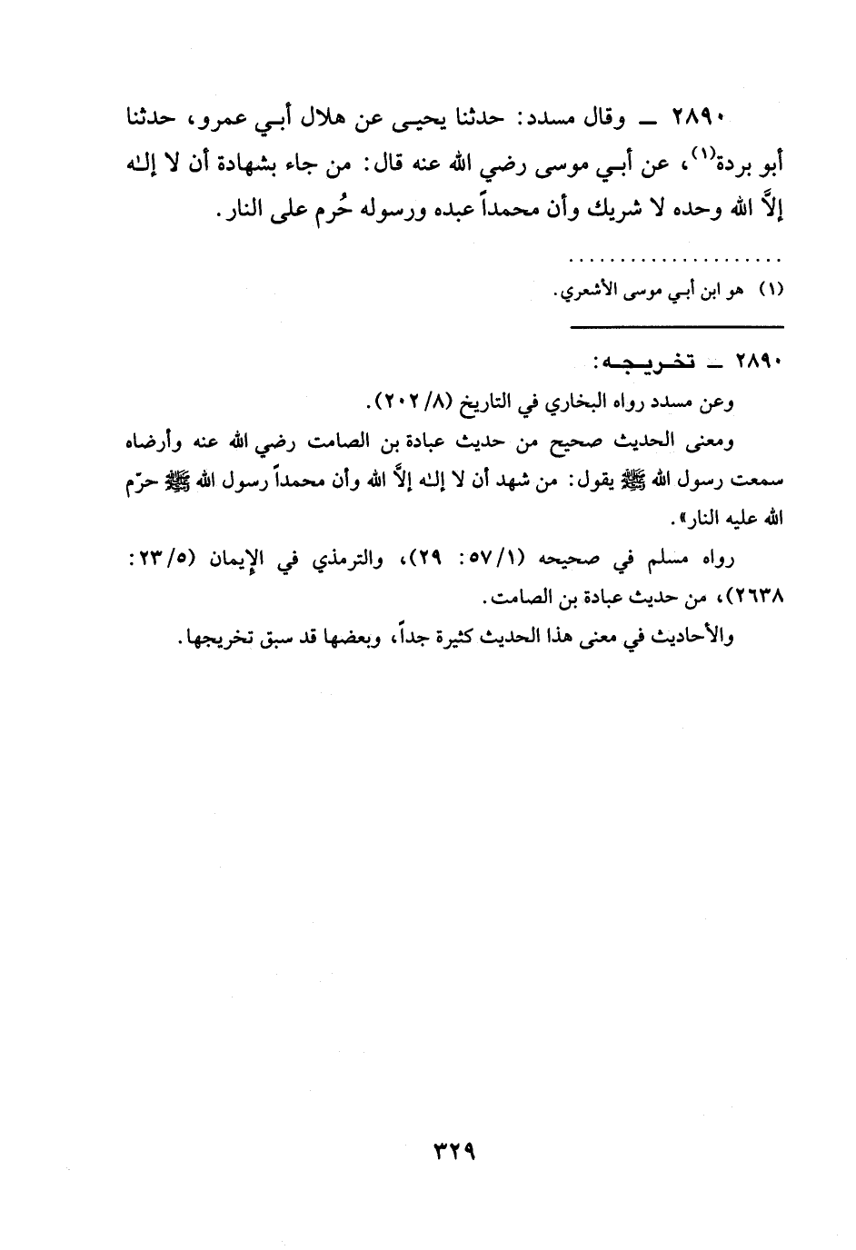 2890 - وَقَالَ مُسَدَّدٌ: حَدَّثَنَا يَحْيَى عَنْ هلال أبي عمرو، حدثنا أبو بُرْدَةَ، عَنْ أَبِي مُوسَى رَضِيَ الله عَنْه قَالَ: §مَنْ جَاءَ بِشَهَادَةِ أَنْ لَا إِلَهَ إِلَّا اللَّهُ وَحْدَهُ لَا شَرِيكَ وَأَنَّ مُحَمَّدًا عَبْدُهُ وَرَسُولُهُ حُرِّمَ عَلَى النَّارِ ,