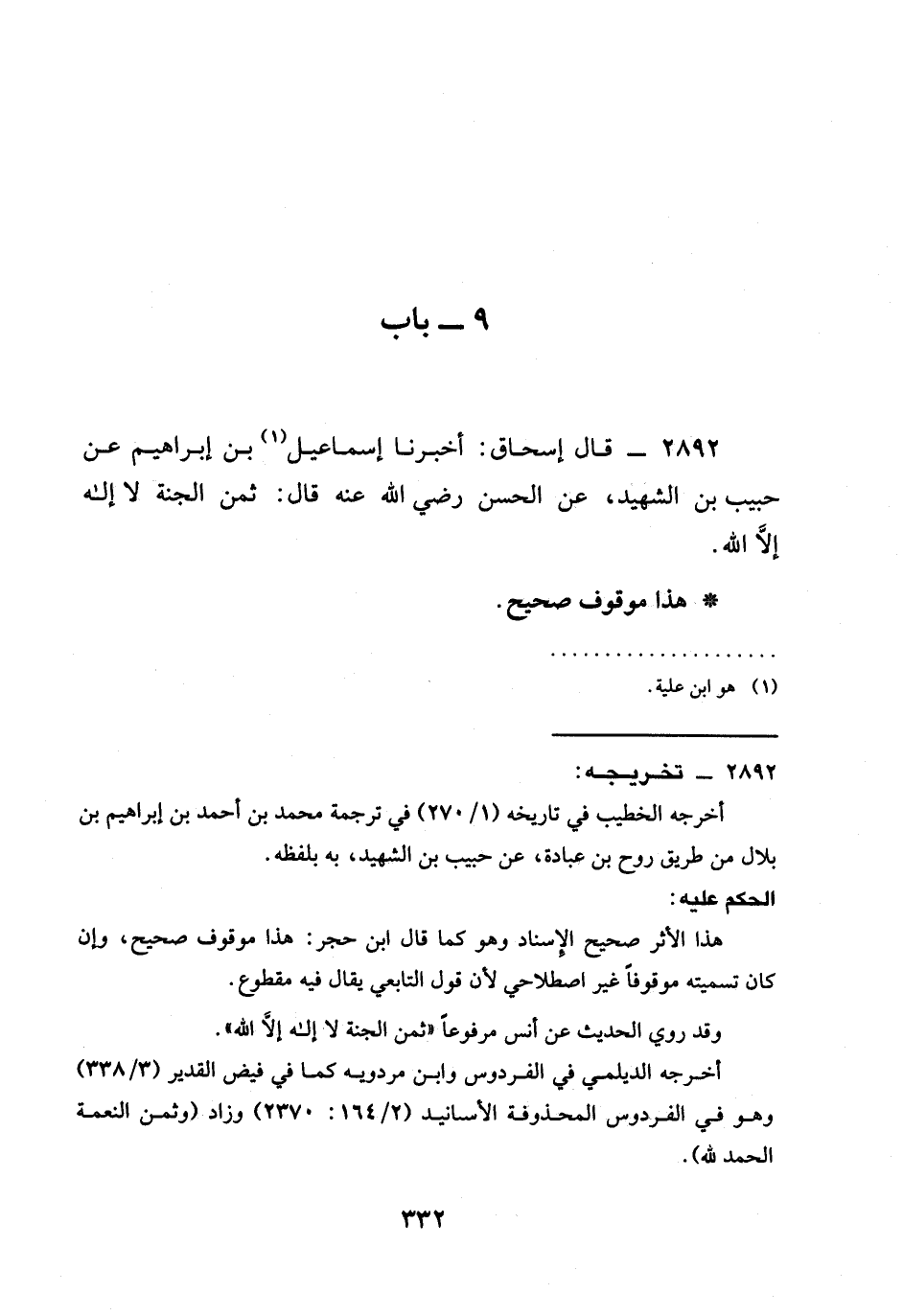 2892 - قَالَ إِسْحَاقُ: أَخْبَرَنَا إِسْمَاعِيلُ بْنُ إِبْرَاهِيمَ عَنْ حَبِيبِ بْنِ الشَّهِيدِ، عَنِ الْحَسَنِ رَضِيَ الله عَنْه قَالَ: §ثَمَنُ الْجَنَّةِ لَا إِلَهَ إلا الله.