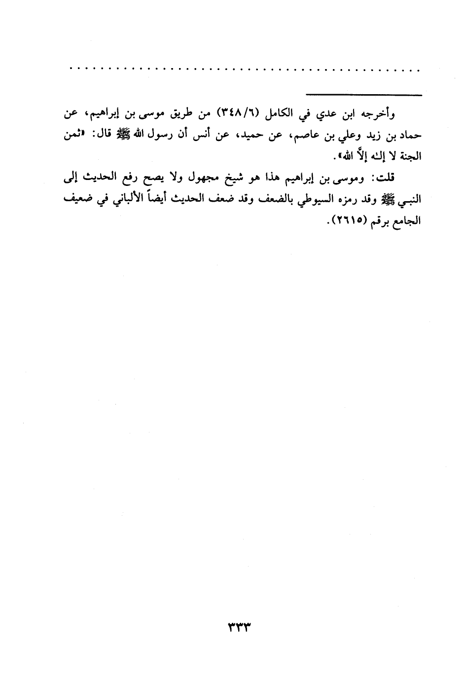 = وأخرجه ابن عديّ في الكامل (6/ 348) من طريق موسى بن إبراهيم، عن حماد بن زيد وعلي بن عاصم، عن حميد، عَنْ أَنَسٍ أَنَّ رَسُولَ اللَّهِ -صَلَّى اللَّهُ عليه وسلم- قَالَ: "ثَمَنُ الْجَنَّةِ لَا إِلَهَ إِلَّا اللَّهُ".