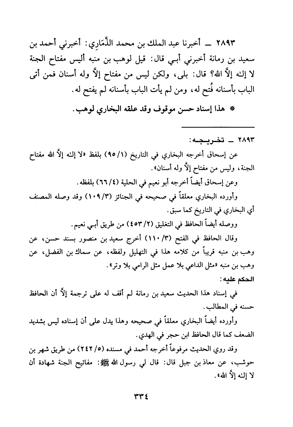 2893 - أخبرنا عَبْدُ الْمَلِكِ بْنُ مُحَمَّدٍ الذماري: أخبرني أحمد بن سَعِيدِ بن رمانة أخبرني أبي قَالَ: قِيلَ لِوَهْبِ بْنِ مُنَبِّهٍ أَلَيْسَ مِفْتَاحُ الْجَنَّةِ لَا إِلَهَ إِلَّا اللَّهُ؟ قَالَ: بَلَى، وَلَكِنْ §لَيْسَ مِنْ مِفْتَاحٍ إِلَّا وَلَهُ أَسْنَانٌ فَمَنْ أَتَى الْبَابَ بَأَسْنَانِهِ فُتِحَ لَهُ، وَمَنْ لَمْ يَأْتِ الْبَابَ بِأَسْنَانِهِ لَمْ يُفْتَحْ لَهُ.