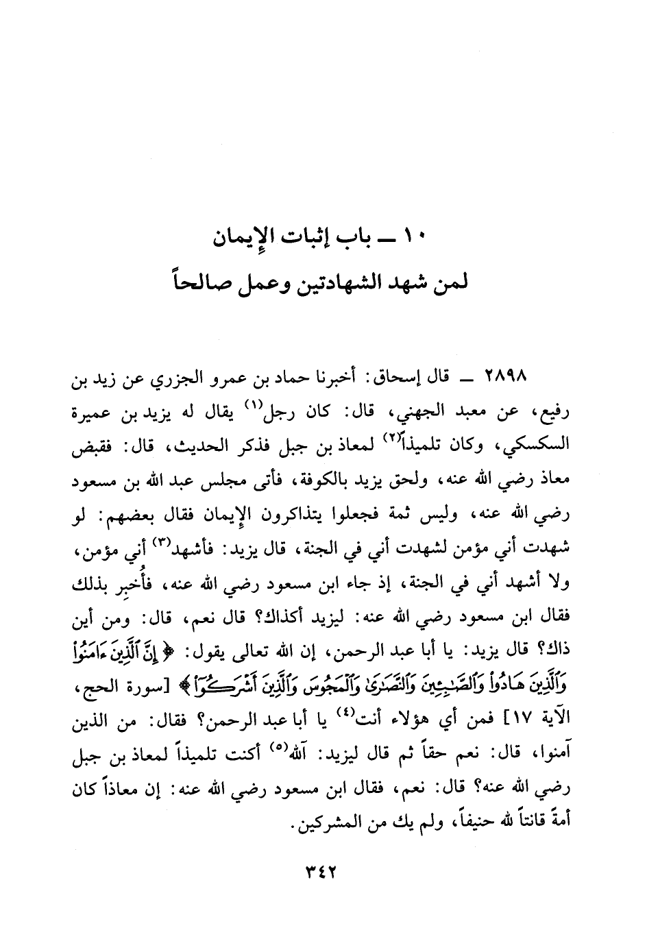 2898 - قَالَ إِسْحَاقُ: أخبرنا حَمَّادُ بْنُ عَمْرٍو الْجَزَرِيُّ عَنْ زَيْدِ بْنِ رُفَيْعٍ، عَنْ مَعْبَدٍ الْجُهَنِيِّ، قَالَ: كَانَ رَجُلٌ يُقَالُ لَهُ يَزِيدُ بْنُ عَمِيرَةَ السَّكْسَكِيُّ، وَكَانَ تِلْمِيذًا لِمُعَاذِ بْنِ جَبَلٍ فَذَكَرَ الْحَدِيثَ، قَالَ: فَقُبِضَ مُعَاذٌ رَضِيَ الله عَنْه، وَلَحِقَ يَزِيدُ بِالْكُوفَةِ، فَأَتَى مَجْلِسَ عَبْدِ اللَّهِ بْنِ مسعود رَضِيَ الله عَنْه، وليس ثمة فَجَعَلُوا يَتَذَاكَرُونَ الْإِيمَانَ فَقَالَ بَعْضُهُمْ: لَوْ شَهِدْتُ أَنِّي مُؤْمِنٌ لَشَهِدْتُ أَنِّي فِي الْجَنَّةِ، قال يزيد: فأشهد أَنِّي مُؤْمِنٌ، وَلَا أَشْهَدُ أَنِّي فِي الْجَنَّةِ، إِذْ جَاءَ ابْنُ مَسْعُودٍ رَضِيَ الله عَنْه، فَأُخْبِرَ بِذَلِكَ فَقَالَ ابْنُ مَسْعُودٍ رَضِيَ الله عَنْه: لِيَزِيدَ أكذاك؟ قَالَ نَعَمْ، قَالَ: ومن أين ذاك؟ قَالَ يَزِيدُ: يَا أَبَا عَبْدِ الرَّحْمَنِ، إن الله تعالى يَقُولُ: {إِنَّ الَّذِينَ ءامنوا وَالَّذِينَ هَادُوا وَالصَّابِئِينَ وَالنَّصَارَى وَالْمَجُوسَ والذي أشركوا} [سورة الحج، الآية 17] فَمِنْ أَيِّ هَؤُلَاءِ أَنْتَ يَا أَبَا عَبْدِ الرَّحْمَنِ؟ فَقَالَ: مِنَ الَّذِينَ آمَنُوا، قَالَ: نَعَمْ حَقًّا ثُمَّ قَالَ لِيَزِيدَ: آللَّهُ أَكُنْتَ تِلْمِيذًا لِمُعَاذِ بن جبل رَضِيَ الله عَنْه؟ قال: نَعَمْ، فَقَالَ ابْنُ مَسْعُودٍ رَضِيَ الله عَنْه: إِنَّ §مُعَاذًا كَانَ أُمَّةً قَانِتًا لِلَّهِ حَنِيفًا، ولم يك من المشركين.