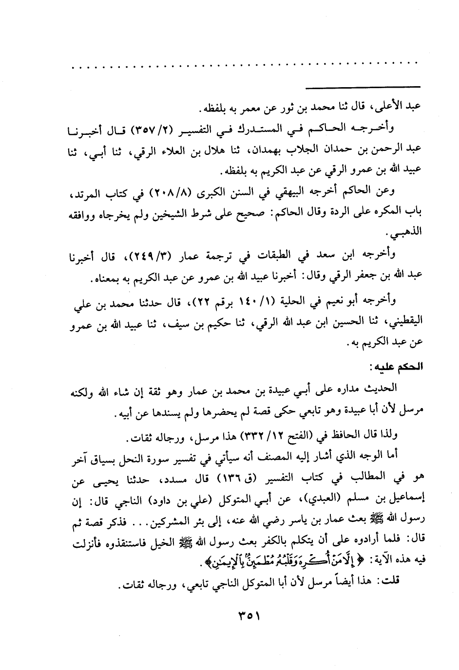 أما الوجه الذي أشار إليه المصنف أنه سيأتي في تفسير سورة النحل بسياق آخر هو في المطالب في كتاب التفسير (ق 136) قَالَ مُسَدَّدٌ، حَدَّثَنَا يَحْيَى عَنْ إِسْمَاعِيلَ بْنِ مسلم (العبدي)، عن أبي المتوكل (علي بن داود) النَّاجِيِّ قَالَ: إِنَّ رَسُولَ اللَّهِ -صَلَّى اللَّهُ عليه وسلم- بعث عمار بن ياسر رضي الله عنه، إلى بئر المشركين ... فذكر قصة ثم قال: فَلَمَّا أَرَادُوهُ عَلَى أَنْ يَتَكَلَّمَ بِالْكُفْرِ بَعَثَ رَسُولُ اللَّهِ -صَلَّى اللَّهُ عَلَيْهِ وَسَلَّمَ- الْخَيْلَ فاستنقذوه فأنزلت فيه هَذِهِ الْآيَةُ: {إِلَّا مَنْ أُكْرِهَ وَقَلْبُهُ مُطْمَئِنٌّ بِالْإِيمَانِ}.