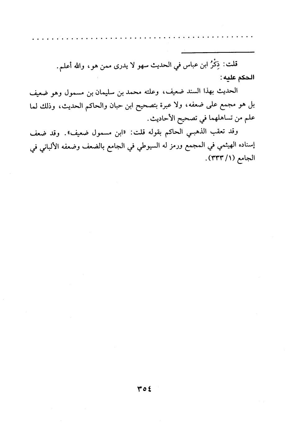 وقد تعقب الذهبي الحاكم بقوله قلت: "ابن مسمول ضعيف". وقد ضعف إسناده الهيثمي في المجمع ورمز له السيوطي في الجامع بالضعف وضعفه الألباني في الجامع (1/ 333).