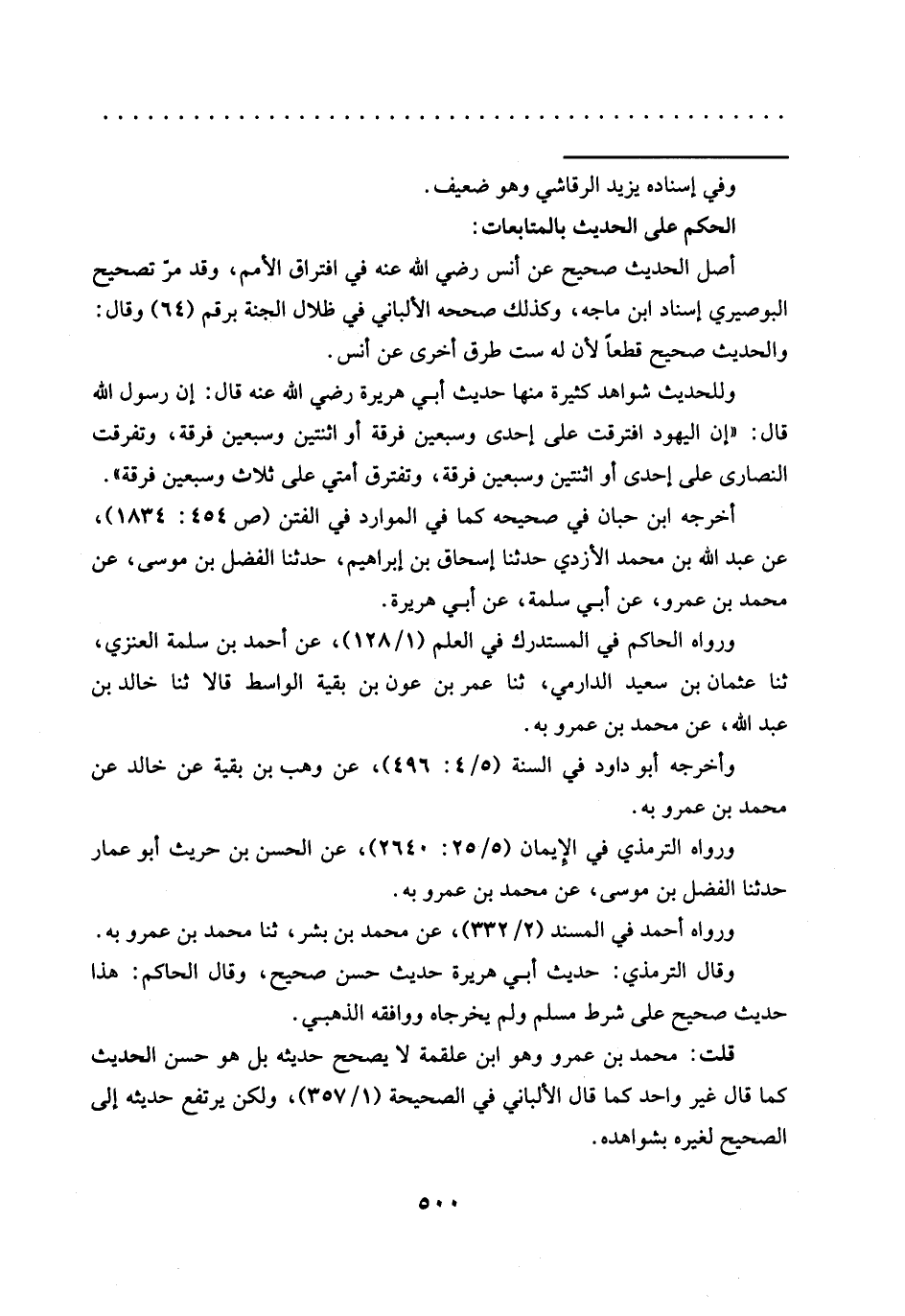 أصل الحديث صحيح عن أنس رضي الله عنه في افتراق الأمم، وقد مرّ تصحيح البوصيري إسناد ابن ماجه، وكذلك صححه الألباني في ظلال الجنة برقم (64) وقال: والحديث صحيح قطعًا لأنّ له ست طرق أخرى عن أنس.