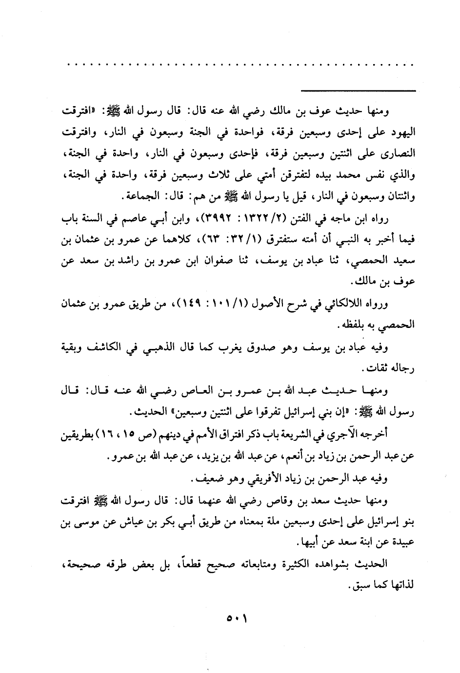 = ومنها حديث عَوْفِ بْنِ مَالِكٍ رَضِيَ اللَّهُ عَنْهُ قَالَ: قَالَ رَسُولُ اللَّهِ -صلى الله عليه وسلم-: "افترقت اليهود على إحدى وسبعين فرقة، فواحدة في الجنة وسبعون في النار، وافترقت النصارى على اثنتين وسبعين فرقة، فإحدى وسبعون في النار، واحدة في الجنة، والذي نفس محمَّد بيده لتفترقن أمتي على ثلاث وسبعيق فرقة، واحدة في الجنة، واثنتان وسبعون في النار، قيل يا رسول الله -صلى الله عليه وسلم- من هم: قال: الجماعة.