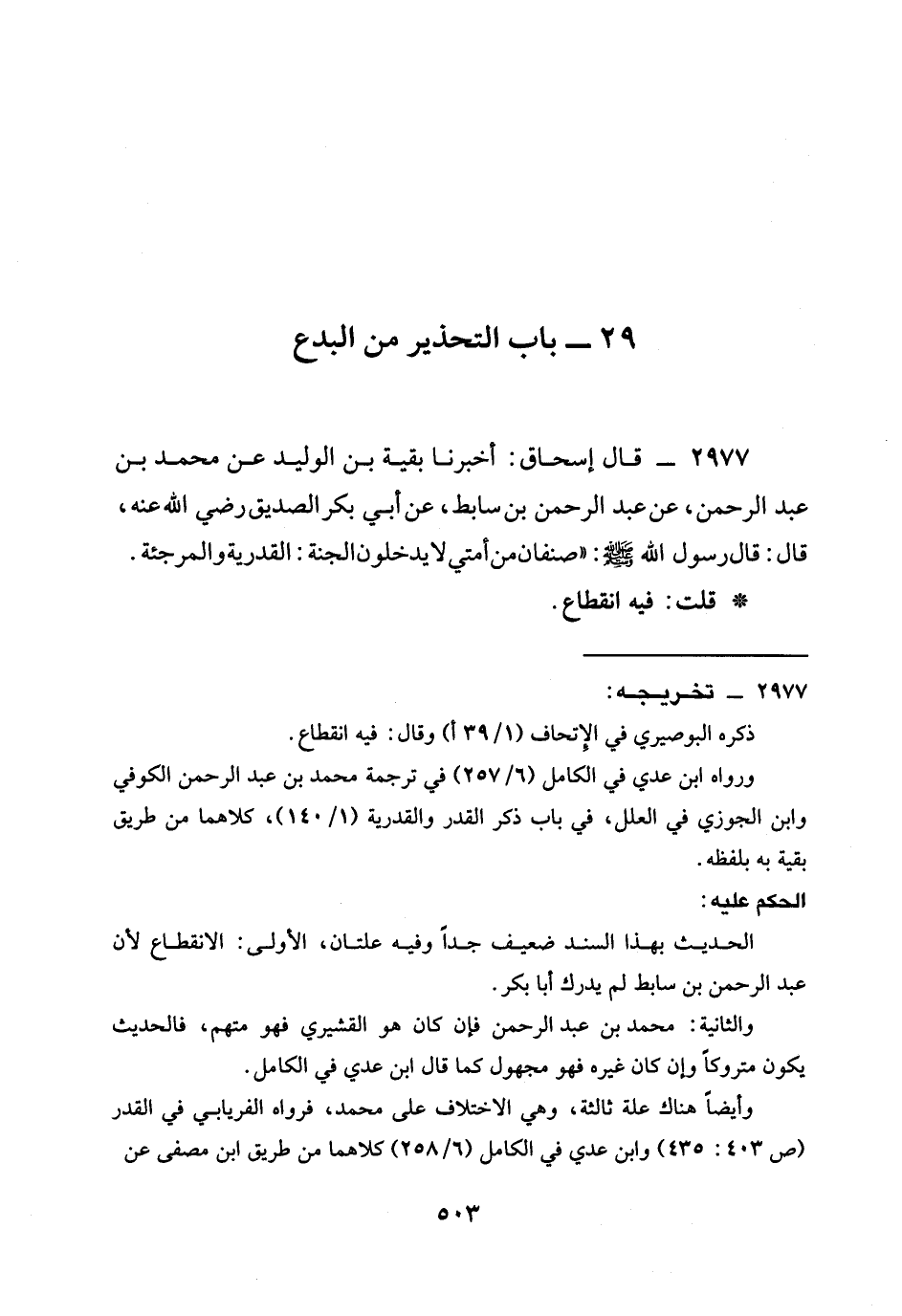 2977 - قَالَ إِسْحَاقُ: أَخْبَرَنَا بَقِيَّةُ بْنُ الْوَلِيدِ عَنْ مُحَمَّدِ بْنِ عَبْدِ الرَّحْمَنِ، عَنْ عَبْدِ الرَّحْمَنِ بْنِ سَابِطٍ، عَنْ أَبِي بَكْرٍ الصِّدِّيقِ رَضِيَ الله عَنْهُ، قَالَ: قَالَ رَسُولُ اللَّهِ صَلَّى اللَّهُ عَلَيْهِ وَسَلَّمَ: " §صِنْفَانِ مِنْ أُمَّتِي لَا يَدْخُلُونَ الْجَنَّةَ: الْقَدَرِيَّةُ وَالْمُرْجِئَةُ.