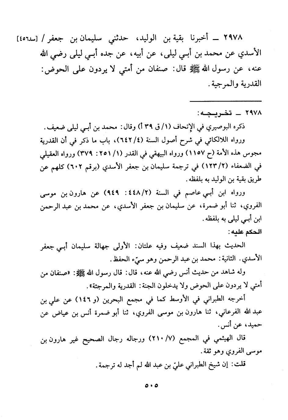 2978 - أَخْبَرَنَا بَقِيَّةُ بْنُ الْوَلِيدِ، حَدَّثَنِي سُلَيْمَانُ بْنُ جَعْفَرٍ / الْأَسَدِيُّ عَنْ مُحَمَّدِ بْنِ أَبِي لَيْلَى، عَنْ أَبِيهِ، عَنْ جَدِّهِ أَبِي لَيْلَى رَضِيَ الله عَنْهُ، عَنْ رَسُولِ اللَّهِ صَلَّى اللَّهُ عَلَيْهِ وَسَلَّمَ قَالَ: §صِنْفَانِ مِنْ أُمَّتِي لَا يَرِدُونَ عَلَيَّ الْحَوْضَ الْقَدَرِيَّةُ والمرجية.